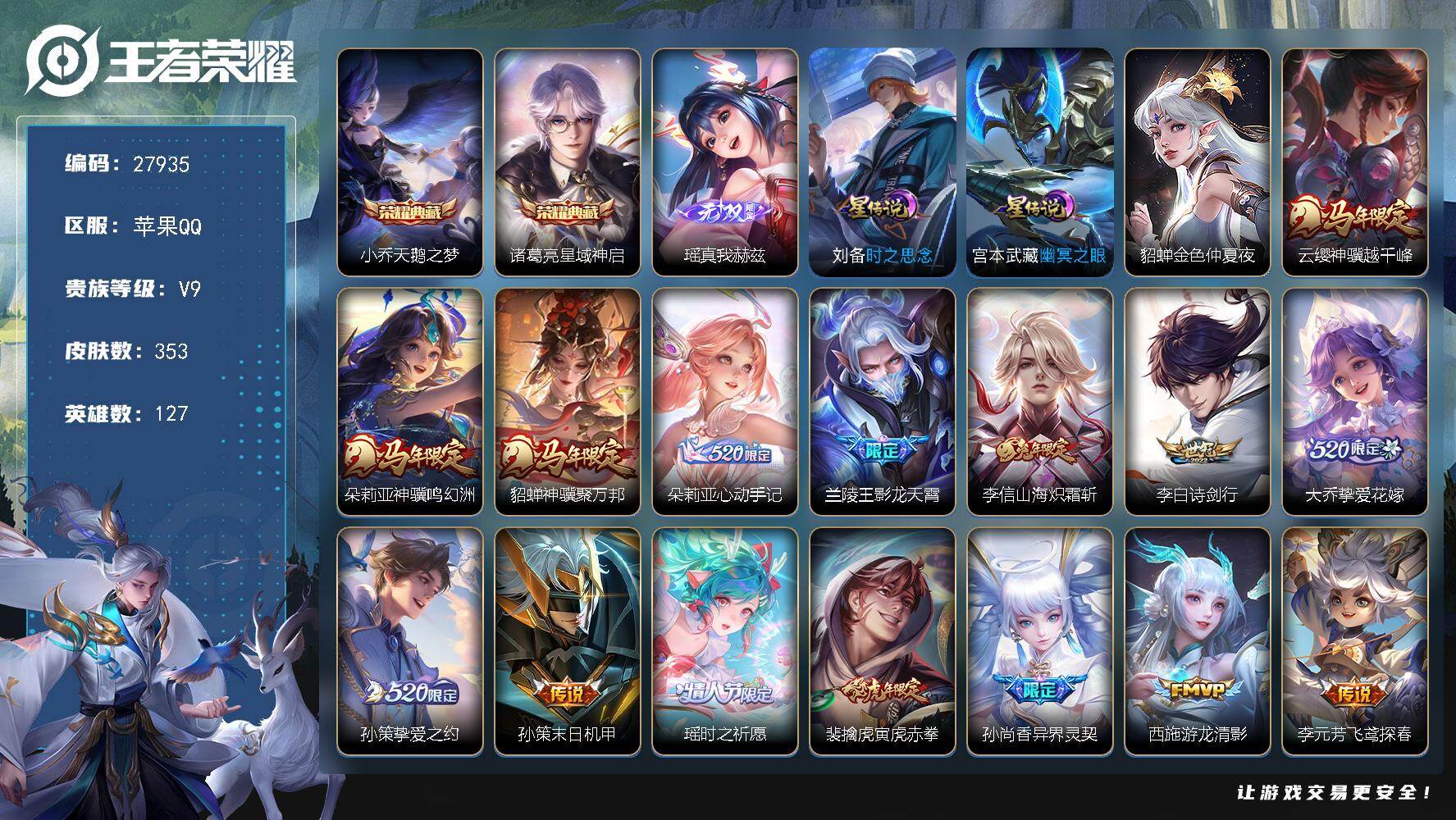 PX_2540048-可换绑【精品v9号·典藏诸葛亮小乔·无双瑶·马年貂蝉朵丽亚云嘤·520限定朵丽亚大乔孙策·时之祈愿·太华·武陵仙君·凤求凰·天魔缭乱·龙年安琪拉·飞衡青龙志至尊宝·2传说天幕·贵族积分15.6w】,313幸运值,12按键,2天幕,3星传说,24王者印记,230五级铭文,无二次苹果Q-V9-353皮肤-2典藏皮肤-1无双-29传说-111史诗【英雄全皮】:刘邦全皮,孙权全皮,猪八戒全皮,敖隐全皮,蒙恬全皮,金蝉全皮,影全皮,海诺全皮【荣耀典藏】:小乔天鹅之梦,诸葛亮星域神启【无双皮肤】:瑶真我赫兹【星元皮肤】:刘备时之思念,宫本武藏幽冥之眼,貂蝉金色仲夏夜【天幕】:金虎啸春天幕,挚爱童话天幕【传说皮肤】:云缨神骥越千峰,朵莉亚神骥鸣幻洲,貂蝉神骥聚万邦,朵莉亚心动手记,兰陵王影龙天霄,李信山海炽霜斩,李白诗剑行,大乔挚爱花嫁,孙策挚爱之约,孙策末日机甲,瑶时之祈愿,裴擒虎寅虎赤拳,孙尚香异界灵契,西施游龙清影,李元芳飞鸢探春,镜炽阳神光,虞姬启明星使,刘备时之恋人,伽罗太华,貂蝉猫影幻舞,干将莫邪久胜战神,虞姬云霓雀翎,花木兰冠军飞将,梦奇胖达荣荣,杨戬永曜之星,诸葛亮武陵仙君,李白凤求凰,宫本武藏地狱之眼,吕布天魔缭乱【限定皮肤】:白起狰,姜子牙天穹之誓,杨戬破阵退雄兵,狄仁杰阴阳师,赵云皇家上将,赵云龙胆,墨子神迹守卫,妲己时之彼端,嬴政白昼王子,孙尚香蔷薇恋人,孙尚香异界灵契,鲁班七号狮舞东方,庄周蜃楼王,庄周高山流水,高渐离玩趣恶龙,阿轲迷踪丽影,芈月重明,吕布天魔缭乱,吕布猎兽之王,周瑜赤莲之焰,夏侯惇朔风刀,甄姬游园惊梦,典韦穷奇,典韦蓝屏警告,马可波罗逐梦之星,马可波罗暗影游猎,狄仁杰魔术师,狄仁杰万华元夜,达摩星际陆战队,达摩沙漠行僧,项羽海滩派对,老夫子醍醐杖,老夫子航海奇遇记,关羽冰锋战神,程咬金演武夺筹,刘邦夺宝奇兵,韩信飞衡,兰陵王影龙天霄,兰陵王驯魔猎人,兰陵王金庭之子,亚瑟狮心王,孙悟空至尊宝,孙悟空大圣娶亲,孙悟空孙行者,牛魔御旌,后羿辉光之辰,后羿如梦令,后羿圣弓游侠,刘备百相守梦,李元芳银河之约,李元芳云中旅人,虞姬启明星使,钟馗神迹守卫,钟馗驱傩正仪,杨玉环遇见飞天,杨戬永曜之星,女娲朔望之晖,干将莫邪冰霜恋舞曲,干将莫邪真爱魔法,雅典娜黎明之约,蔡文姬繁星吟游,鬼谷子原初探秘者,鬼谷子五谷丰年,诸葛亮武陵仙君,大乔挚爱花嫁,铠青龙志,苏烈千军破阵,百里玄策原初追逐者,百里守约朱雀志,弈星混沌棋,梦奇顽趣,沈梦溪星空之诺,沈梦溪大漠名商,明世隐疑决卦,裴擒虎李小龙,裴擒虎寅虎赤拳,裴擒虎擒涛扼浪,米莱狄御霄,米莱狄胡桃异想国,瑶时之祈愿,云中君纤云弄巧,云中君时之祈愿,李信山海炽霜斩,伽罗太华,盾山御銮,孙策挚爱之约,猪八戒西部大镖客,猪八戒猪悟能,上官婉儿梁祝,嫦娥如梦令,嫦娥拒霜思,鲁班大师探海日志,桑启海盐诗旅,金蝉唐三藏,艾琳女武神,赵怀真鹤归松栖,张良古海寻踪,蒙恬荣光圣徽,鬼谷子天穹祈灯,安琪拉乘龙聚宝船,刘邦剑破天穹,上官婉儿群星魔术团,程咬金群星魔术团,镜青焰无极,项羽苍威无极,朵莉亚心动手记,海诺心动手记,刘备异域游侠,周瑜熔金海岸【年限皮肤】:李白凤求凰,杨戬永曜之星,后羿辉光之辰,百里守约朱雀志,铠青龙志,伽罗太华,韩信飞衡,裴擒虎寅虎赤拳,李信山海炽霜斩,安琪拉乘龙聚宝船【赛季限定】:亚瑟狮心王,庄周蜃楼王,白起狰,芈月重明,典韦穷奇,米莱狄御霄,牛魔御旌,盾山御銮,夏侯惇朔风刀,弈星混沌棋,明世隐疑决卦,老夫子醍醐杖,鬼谷子原初探秘者,狄仁杰万华元夜,程咬金演武夺筹,钟馗驱傩正仪,苏烈千军破阵,达摩沙漠行僧,兰陵王金庭之子,沈梦溪大漠名商,李元芳云中旅人,桑启海盐诗旅,裴擒虎擒涛扼浪,鲁班大师探海日志,张良古海寻踪,鬼谷子天穹祈灯,刘邦剑破天穹,姜子牙天穹之誓,钟馗虚灵犬护,甄姬逆浪荇歌,亚瑟荣光之誓,百里玄策原初追逐者,雅典娜黎明之约,梦奇顽趣,蒙恬荣光圣徽,牛魔星界战将 【战令限定】:嬴政白昼王子,吕布猎兽之王,典韦蓝屏警告,女娲朔望之晖,鲁班七号狮舞东方,钟馗神迹守卫,兰陵王驯魔猎人,周瑜赤莲之焰,李元芳银河之约,沈梦溪星空之诺,阿轲迷踪丽影,刘邦夺宝奇兵,马可波罗暗影游猎,猪八戒西部大镖客,米莱狄胡桃异想国,达摩星际陆战队,老夫子航海奇遇记,墨子神迹守卫,干将莫邪真爱魔法,后羿圣弓游侠,镜青焰无极,项羽苍威无极,周瑜线条小狗,小乔线条小狗【史诗皮肤】:太乙真人瓦猫非猫,周瑜线条小狗,小乔线条小狗,少司缘巫礼祀神,黄忠百相守梦,狂铁龙之律动,牛魔星界战将,黄忠怒海争锋,海诺心动手记,镜青焰无极,上官婉儿群星魔术团,安琪拉乘龙聚宝船,蒙恬荣光圣徽,莱西奥末日机甲,赵怀真鹤归松栖,刘备百相守梦,梦奇顽趣,鬼谷子五谷丰年,金蝉唐三藏,澜赏金猎手,云中君时之祈愿,雅典娜黎明之约,嫦娥拒霜思,司马懿暗渊魔法,庄周高山流水,猪八戒猪悟能,孙悟空孙行者,安琪拉时之奇旅,沈梦溪月团寄思,干将莫邪真爱魔法,老夫子航海奇遇记,蒙犽龙鼓争鸣,西施诗语江南,米莱狄胡桃异想国,云中君纤云弄巧,裴擒虎李小龙,百里玄策原初追逐者,马可波罗暗影游猎,孙尚香时之恋人,赵云龙胆,瑶遇见神鹿,马超神威,阿轲迷踪丽影,不知火舞魅语,小乔青蛇,后羿如梦令,嫦娥如梦令,妲己时之彼端,韩信飞衡,娜可露露晚萤,李元芳银河之约,蔡文姬繁星