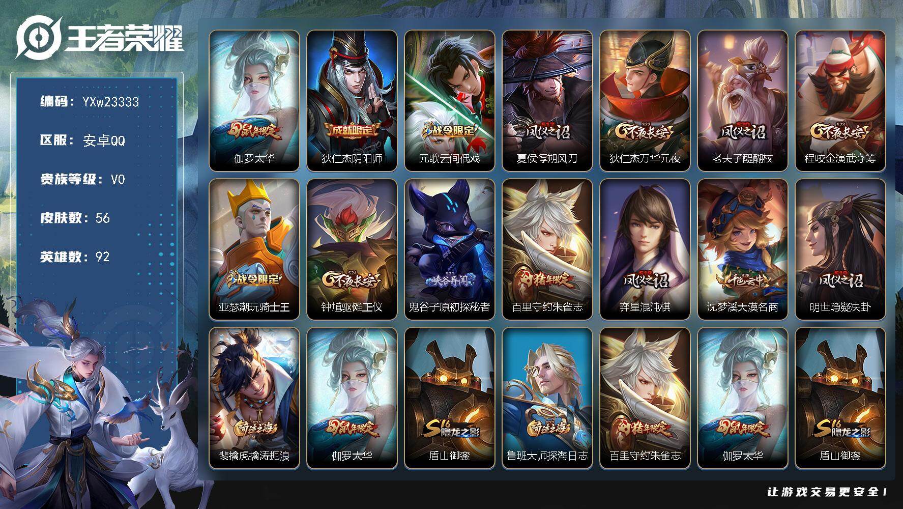 PX_2553001-??小号·太华·朱雀志·可二次】YXw23333-安卓Q-92英雄-56皮肤-1王者印记-84铭文-贵族积分0w【贵族1】【1传说】【因赛季更新游戏段付以上号为准!】 【传说皮肤】:伽罗太华 【限定皮肤】:狄仁杰阴阳师,元歌云间偶戏,夏侯惇朔风刀,狄仁杰万华元夜,老夫子醍醐杖,程咬金演武夺筹,亚瑟潮玩骑士王,钟馗驱傩正仪,鬼谷子原初探秘者,百里守约朱雀志,弈星混沌棋,沈梦溪大漠名商,明世隐疑决卦,裴擒虎擒涛扼浪,伽罗太华,盾山御銮,鲁班大师探海日志 【年限皮肤】:百里守约朱雀志,伽罗太华 【赛季限定】:盾山御銮,夏侯惇朔风刀,弈星混沌棋,明世隐疑决卦,老夫子醍醐杖,鬼谷子原初探秘者,狄仁杰万华元夜,程咬金演武夺筹,钟馗驱傩正仪,沈梦溪大漠名商,裴擒虎擒涛扼浪,鲁班大师探海日志,太乙真人谧流熔炉 【战令限定】:元歌云间偶戏,亚瑟潮玩骑士王 【史诗皮肤】:元歌云间偶戏,狄仁杰鹰眼统帅,百里守约朱雀志,百里守约特工魅影,墨子金属风暴,妲己魅力维加斯,孙尚香水果甜心 【其他皮肤】:艾琳鹤鸣心笺,西施雪境奇遇,典韦铁骨偃魂,太乙真人谧流熔炉,苍苍林狼骑,海诺时空谍影,鲁班大师探海日志,莱西奥西部游侠,裴擒虎擒涛扼浪,沈梦溪大漠名商,鲁班大师乓乓大师,钟馗驱傩正仪,张良缤纷绘卷,程咬金演武夺筹,亚瑟潮玩骑士王,狄仁杰万华元夜,鬼谷子原初探秘者,老夫子醍醐杖,明世隐疑决卦,弈星混沌棋,夏侯惇朔风刀,姜子牙炽热元素使,孙膑归虚梦演,盾山御銮,苏烈坚韧之力,孙尚香沉稳之力,老夫子功夫老勺,狄仁杰阴阳师,宫本武藏万象初新,花木兰兔女郎,达摩拳王,亚瑟死亡骑士,典韦黄金武士,安琪拉玩偶对对碰,牛魔西部大镖客,达摩大发明家,韩信街头霸王,韩信教廷特使,伽罗花见巫女,元歌午夜歌剧院,公孙离花间舞,女娲尼罗河女神,苏烈爱与和平,百里守约绝影神枪,东皇太一东海龙王,黄忠芝加哥教父,诸葛亮星航指挥官,哪吒三太子