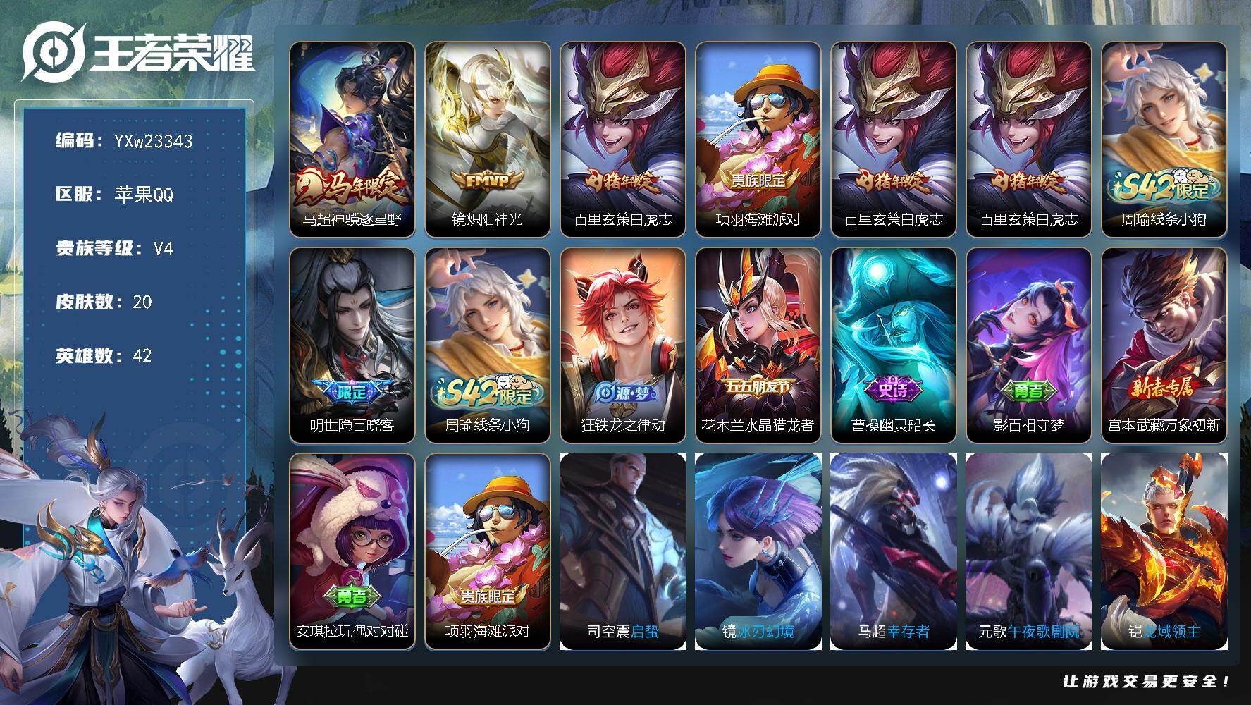 PX_2553006-??小号推荐·神骥逐星野·炽阳神光·白虎志·无二次包过】YXw23343-苹果Q-42英雄-20皮肤-1王者印记-22铭文-贵族积分0w【贵族4】【3传说】【因赛季更新游戏段付以上号为准!】 【传说皮肤】:马超神骥逐星野,镜炽阳神光,百里玄策白虎志 【限定皮肤】:项羽海滩派对,百里玄策白虎志 【年限皮肤】:百里玄策白虎志 【战令限定】:周瑜线条小狗 【史诗皮肤】:明世隐百晓客,周瑜线条小狗,狂铁龙之律动,花木兰水晶猎龙者,曹操幽灵船长 【其他皮肤】:影百相守梦,宫本武藏万象初新,安琪拉玩偶对对碰,项羽海滩派对,司空震启蛰,镜冰刃幻境,马超幸存者,元歌午夜歌剧院,铠龙域领主,杨戬埃及法老,李白范海辛