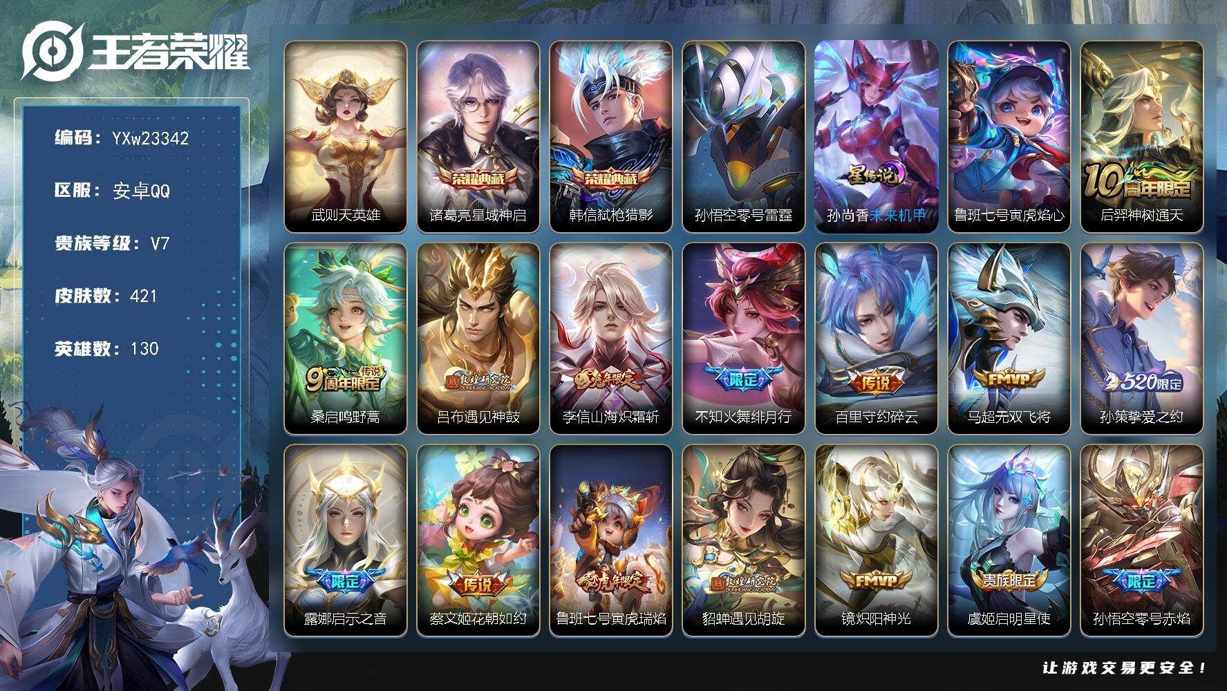 PX_2553005-??推荐·星域神启·弑枪猎影·寅虎焰心·山海炽霜斩·绯月行·太华·无双飞将·启示之音·零号赤焰·一念神魔·飞衡·可二次】YXw23342-安卓Q-130英雄-421皮肤-22王者印记-300铭文-贵族积分9w【贵族7】【3典藏·3星传说·23传说·1天幕·13按键】【因赛季更新游戏段付以上号为准!】 【英雄全皮】:刘邦全皮,孙权全皮,鬼谷子全皮,苏烈全皮,狂铁全皮,敖隐全皮,空空儿全皮 【荣耀典藏】:武则天英雄,诸葛亮星域神启,韩信弑枪猎影 【星元皮肤】:鲁班七号寅虎焰心,孙悟空零号雷霆,孙尚香未来机甲 【天幕】:共赏芳华天幕 【传说皮肤】:后羿神树通天,桑启鸣野蒿,吕布遇见神鼓,李信山海炽霜斩,不知火舞绯月行,百里守约碎云,马超无双飞将,孙策挚爱之约,露娜启示之音,蔡文姬花朝如约,鲁班七号寅虎瑞焰,貂蝉遇见胡旋,镜炽阳神光,虞姬启明星使,孙悟空零号赤焰,曜云鹰飞将,李信一念神魔,伽罗太华,干将莫邪久胜战神,虞姬云霓雀翎,达摩黄金狮子座,孙尚香末日机甲,宫本武藏地狱之眼 【限定皮肤】:白起狰,姜子牙天穹之誓,李白谪仙醉月,狄仁杰阴阳师,虞姬凯尔特女王,赵云皇家上将,墨子神迹守卫,妲己时之奇旅,嬴政优雅恋人,嬴政白昼王子,孙尚香蔷薇恋人,鲁班七号狮舞东方,鲁班七号寅虎瑞焰,庄周蜃楼王,庄周高山流水,高渐离玩趣恶龙,阿轲迷踪丽影,钟无艳超时空战士,孙膑妖精王,扁鹊炼金王,白起夜都怪侠,芈月重明,芈月幻夜卜梦,吕布猎兽之王,吕布遇见神鼓,元歌云间偶戏,元歌无心,夏侯惇朔风刀,夏侯惇匿光决锋者,甄姬女儿国国王,甄姬游园惊梦,甄姬落雪兰心,曹操烛龙,典韦穷奇,马可波罗暗影游猎,狄仁杰魔术师,狄仁杰万华元夜,达摩星际陆战队,达摩沙漠行僧,项羽海滩派对,老夫子醍醐杖,老夫子航海奇遇记,貂蝉遇见胡旋,程咬金演武夺筹,露娜启示之音,刘邦夺宝奇兵,韩信飞衡,韩信傲雪梅枪,王昭君午后时光,兰陵王驯魔猎人,兰陵王金庭之子,不知火舞绯月行,亚瑟潮玩骑士王,孙悟空至尊宝,孙悟空零号赤焰,孙悟空孙行者,牛魔御旌,后羿圣弓游侠,李元芳匿光侦查者,李元芳云中旅人,虞姬启明星使,钟馗神迹守卫,钟馗驱傩正仪,杨玉环遇见飞天,干将莫邪真爱魔法,雅典娜单词大作战,雅典娜黎明之约,太乙真人饕餮,鬼谷子原初探秘者,鬼谷子五谷丰年,黄忠烈魂,黄忠火炮绅士,铠青龙志,苏烈玄武志,苏烈千军破阵,百里玄策原初追逐者,百里守约朱雀志,弈星混沌棋,梦奇顽趣,沈梦溪大漠名商,明世隐疑决卦,明世隐吟游魔法,裴擒虎李小龙,裴擒虎擒涛扼浪,狂铁御狮,狂铁电玩高手,米莱狄御霄,米莱狄胡桃异想国,云中君纤云弄巧,李信山海炽霜斩,伽罗太华,伽罗天狼溯光者,盾山御銮,孙策挚爱之约,猪八戒西部大镖客,上官婉儿梁祝,上官婉儿天狼绘梦者,嫦娥拒霜思,嫦娥暖冬兔眠,蒙犽狂想玩偶喵,鲁班大师探海日志,镜匿光追影者,桑启海盐诗旅,暃星界游侠,艾琳流音漫舞,司空震地狱燃心,阿古朵江河有灵,张良古海寻踪,蒙犽百解令,蒙恬荣光圣徽,鬼谷子天穹祈灯,姬小满妄想食味,沈梦溪龙舞盛年,刘邦剑破天穹,程咬金群星魔术团,镜青焰无极,项羽苍威无极,刘备异域游侠,周瑜熔金海岸 【年限皮肤】:苏烈玄武志,百里守约朱雀志,铠青龙志,伽罗太华,韩信飞衡,鲁班七号寅虎瑞焰,李信山海炽霜斩 【赛季限定】:庄周蜃楼王,孙膑妖精王,扁鹊炼金王,虞姬凯尔特女王,白起狰,太乙真人饕餮,曹操烛龙,芈月重明,典韦穷奇,狂铁御狮,米莱狄御霄,牛魔御旌,盾山御銮,夏侯惇朔风刀,弈星混沌棋,明世隐疑决卦,老夫子醍醐杖,鬼谷子原初探秘者,狄仁杰万华元夜,程咬金演武夺筹,钟馗驱傩正仪,苏烈千军破阵,达摩沙漠行僧,兰陵王金庭之子,沈梦溪大漠名商,李元芳云中旅人,桑启海盐诗旅,裴擒虎擒涛扼浪,鲁班大师探海日志,张良古海寻踪,鬼谷子天穹祈灯,刘邦剑破天穹,姜子牙天穹之誓,东皇太一噬灭天穹,太乙真人谧流熔炉,钟馗虚灵犬护,甄姬逆浪荇歌,亚瑟荣光之誓,百里玄策原初追逐者,雅典娜黎明之约,梦奇顽趣,蒙恬荣光圣徽,牛魔星界战将,项羽九幽镇关 【战令限定】:嬴政白昼王子,吕布猎兽之王,鲁班七号狮舞东方,钟馗神迹守卫,兰陵王驯魔猎人,阿轲迷踪丽影,刘邦夺宝奇兵,马可波罗暗影游猎,猪八戒西部大镖客,蒙犽狂想玩偶喵,雅典娜单词大作战,元歌云间偶戏,亚瑟潮玩骑士王,米莱狄胡桃异想国,达摩星际陆战队,老夫子航海奇遇记,墨子神迹守卫,干将莫邪真爱魔法,后羿圣弓游侠,黄忠火炮绅士,芈月幻夜卜梦,明世隐吟游魔法,白起夜都怪侠,狂铁电玩高手,王昭君午后时光,钟无艳超时空战士,甄姬落雪兰心,暃星界游侠,嫦娥暖冬兔眠,司空震地狱燃心,艾琳流音漫舞,镜青焰无极,项羽苍威无极,亚连破空之剑,孙悟空神迹守卫,孙膑茶境仙,马超访茗客,周瑜线条小狗 【史诗皮肤】:周瑜线条小狗,项羽九幽镇关,女娲万灵启世,百里玄策罗小黑战记,公孙离涂山容容,西施织梦人,黄忠百相守梦,扁鹊灵蛊蚀心,狂铁龙之律动,孙膑茶境仙,牛魔星界战将,李白谪仙醉月,亚连破空之剑,镜青焰无极,姬小满妄想食味,蒙恬荣光圣徽,周瑜雪夜绮愿,蒙犽百解令,阿古朵江河有灵,司空震地狱燃心,李元芳匿光侦查者,百里守约真我赫兹,刘禅电玩爆裂旋风,暃星界游侠,梦奇顽趣,元歌无心,鬼谷子五谷丰年,妲己时之奇旅,钟无艳超时空战士,狂铁电玩高手,高渐离天秀音浪,夏侯惇匿光决锋者,明世隐吟游魔法,澜