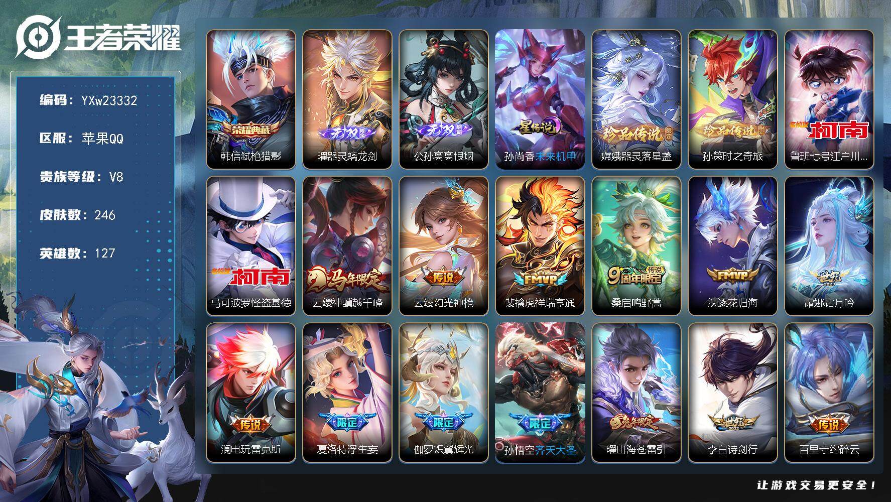 PX_2553000-??主推·弑枪猎影·器灵螭龙剑·离恨烟·器灵落星盏·孙策时之奇旅·江户川柯南·怪盗基德·神骥越千峰·逐花归海·霜月吟·浮生妄·白虎志·可二次】YXw23332-苹果Q-127英雄-246皮肤-8王者印记-182铭文-贵族积分7w【贵族8】【1典藏·2无双·4珍品·1星传说·23传说·1天幕·23按键】【因赛季更新游戏段付以上号为准!】 【英雄全皮】:敖隐全皮,夏洛特全皮,影全皮 【荣耀典藏】:韩信弑枪猎影 【无双皮肤】:曜器灵螭龙剑,公孙离离恨烟 【珍品传说】:嫦娥器灵落星盏,孙策时之奇旅,鲁班七号江户川柯南,马可波罗怪盗基德 【星元皮肤】:孙尚香未来机甲 【天幕】:财神纳福天幕 【传说皮肤】:云缨神骥越千峰,云缨幻光神枪,裴擒虎祥瑞亨通,桑启鸣野蒿,澜逐花归海,露娜霜月吟,澜电玩雷克斯,夏洛特浮生妄,伽罗炽翼辉光,孙悟空齐天大圣,曜山海苍雷引,李白诗剑行,百里守约碎云,马超无双飞将,孙策挚爱之约,孙尚香异界灵契,镜炽阳神光,虞姬启明星使,李信一念神魔,百里玄策白虎志,孙尚香末日机甲,宫本武藏地狱之眼,狄仁杰超时空战士 【限定皮肤】:公孙离离恨烟,暃埋骨钱,姜子牙天穹之誓,狄仁杰阴阳师,赵云皇家上将,墨子降魔,孙尚香异界灵契,钟无艳超时空战士,白起夜都怪侠,元歌无心,甄姬落雪兰心,马可波罗山海玄木吟,狄仁杰魔术师,达摩沙漠行僧,项羽海滩派对,王昭君午后时光,兰陵王金庭之子,孙悟空齐天大圣,李元芳云中旅人,虞姬启明星使,干将莫邪胡桃夹子,太乙真人华丽摇滚,鬼谷子五谷丰年,百里玄策白虎志,弈星混沌棋,梦奇顽趣,沈梦溪大漠名商,明世隐吟游魔法,裴擒虎擒涛扼浪,狂铁电玩高手,瑶山海碧波行,云中君纤云弄巧,伽罗炽翼辉光,孙策挚爱之约,嫦娥拒霜思,嫦娥暖冬兔眠,曜山海苍雷引,鲁班大师匿光启智者,鲁班大师探海日志,桑启海盐诗旅,夏洛特浮生妄,暃星界游侠,艾琳流音漫舞,司空震地狱燃心,张良古海寻踪,蒙犽百解令,高渐离燃音魔法,鬼谷子天穹祈灯,沈梦溪龙舞盛年,刘邦剑破天穹,程咬金群星魔术团,周瑜熔金海岸 【年限皮肤】:百里玄策白虎志,曜山海苍雷引,瑶山海碧波行,马可波罗山海玄木吟 【赛季限定】:弈星混沌棋,达摩沙漠行僧,兰陵王金庭之子,沈梦溪大漠名商,李元芳云中旅人,桑启海盐诗旅,裴擒虎擒涛扼浪,鲁班大师探海日志,张良古海寻踪,鬼谷子天穹祈灯,刘邦剑破天穹,姜子牙天穹之誓,东皇太一噬灭天穹,太乙真人谧流熔炉,钟馗虚灵犬护,甄姬逆浪荇歌,亚瑟荣光之誓,梦奇顽趣,项羽九幽镇关 【战令限定】:明世隐吟游魔法,白起夜都怪侠,狂铁电玩高手,王昭君午后时光,钟无艳超时空战士,甄姬落雪兰心,暃星界游侠,嫦娥暖冬兔眠,司空震地狱燃心,艾琳流音漫舞,高渐离燃音魔法,亚连破空之剑,孙悟空神迹守卫,百里守约百相守梦,老夫子百相守梦,孙膑茶境仙,马超访茗客,周瑜线条小狗,小乔线条小狗 【史诗皮肤】:明世隐百晓客,周瑜线条小狗,小乔线条小狗,项羽九幽镇关,公孙离涂山容容,扁鹊灵蛊蚀心,狂铁龙之律动,弈星万物之道,姬小满飞车小橘子,孙膑茶境仙,百里守约百相守梦,艾琳陌上桑,亚连破空之剑,暃埋骨钱,高渐离燃音魔法,蒙犽百解令,司空震地狱燃心,刘禅电玩爆裂旋风,镜玫瑰异探,瑶山海碧波行,马可波罗山海玄木吟,暃星界游侠,梦奇顽趣,墨子降魔,元歌无心,鬼谷子五谷丰年,钟无艳超时空战士,鲁班大师匿光启智者,狂铁电玩高手,貂蝉唤灵魅影,明世隐吟游魔法,澜赏金猎手,夏洛特永昼,嫦娥拒霜思,沈梦溪月团寄思,云中君纤云弄巧,不知火舞魅语,小乔青蛇,公孙离无限星赏官,狄仁杰鹰眼统帅,伽罗箭羽风息,阿轲节奏热浪,白起星夜王子,程咬金功夫厨神,李元芳逐浪之夏,刘禅天才门将,蔡文姬舞动绿茵,铠曙光守护者,百里守约特工魅影,雅典娜冰冠公主,诸葛亮黄金分割率,兰陵王暗隐猎兽者,小乔缤纷独角兽,夏侯惇乘风破浪,刘邦德古拉伯爵,花木兰水晶猎龙者,张飞乱世虎臣,吕布末日机甲,曹操幽灵船长,刘禅绅士熊喵,墨子金属风暴,妲己女仆咖啡,妲己魅力维加斯,嬴政摇滚巨星,孙尚香水果甜心,宫本武藏鬼剑武藏,廉颇地狱岩魂,狄仁杰魔术师,王昭君偶像歌手,甄姬冰雪圆舞曲,赵云未来纪元,赵云皇家上将,露娜紫霞仙子 【其他皮肤】:影百相守梦,吕布舞狮寰,桑启线条小狗,亚瑟荣光之誓,鬼谷子克喵,甄姬逆浪荇歌,钟馗虚灵犬护,东皇太一金福满堂,姜子牙星梦巡礼,影魅影绮裳,马超访茗客,典韦铁骨偃魂,太乙真人谧流熔炉,苍苍林狼骑,吕布逐霄战戟,干将莫邪雾都夜雨,老夫子百相守梦,亚瑟动物派对,东皇太一噬灭天穹,孙悟空神迹守卫,周瑜熔金海岸,姜子牙天穹之誓,貂蝉长夏之忆,程咬金群星魔术团,盘古经纬探寻者,刘邦剑破天穹,扁鹊无尽旅途,沈梦溪龙舞盛年,亚瑟鸿运当头,廉颇功夫炙烤,朵莉亚金色潮汐,鬼谷子天穹祈灯,程咬金暖冬絮语,后羿完美运算,亚连破局者,海月王牌新星,张良古海寻踪,艾琳流音漫舞,李元芳妄想特派,鲁班大师探海日志,莱西奥西部游侠,太乙真人劲辣红锅,裴擒虎擒涛扼浪,赵怀真太极少年,白起乐园追猎者,牛魔牛运亨通,猪八戒潮玩探月行,海月幻泉雾影,嫦娥暖冬兔眠,桑启海盐诗旅,刘备潮玩造梦师,李元芳云中旅人,甄姬落雪兰心,蒙恬蔚蓝守将,沈梦溪大漠名商,王昭君午后时光,刘禅唤灵魔甲,兰陵王金庭之子,白起夜都怪侠,程咬金无双福将,达摩沙漠行僧,干将莫邪胡桃夹子,典韦铁甲