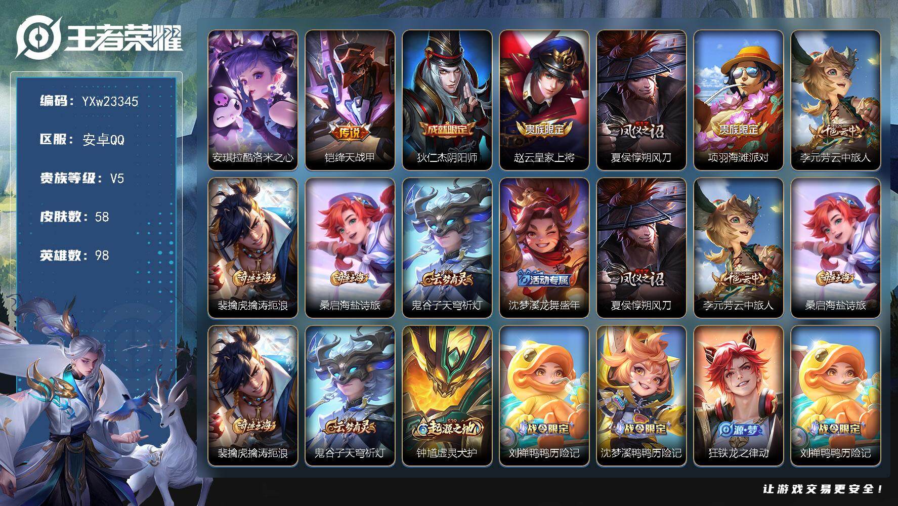 PX_2553008-??小号·拉酷洛米之心·绛天战甲·可二次】YXw23345-安卓Q-98英雄-58皮肤-0王者印记-100铭文-贵族积分0w【贵族5】【1珍品·1星传说·1传说·3按键】【因赛季更新游戏段付以上号为准!】 【珍品传说】:安琪拉酷洛米之心 【星元皮肤】:庄周牧野星辉 【传说皮肤】:铠绛天战甲 【限定皮肤】:狄仁杰阴阳师,赵云皇家上将,夏侯惇朔风刀,项羽海滩派对,李元芳云中旅人,裴擒虎擒涛扼浪,桑启海盐诗旅,鬼谷子天穹祈灯,沈梦溪龙舞盛年 【赛季限定】:夏侯惇朔风刀,李元芳云中旅人,桑启海盐诗旅,裴擒虎擒涛扼浪,鬼谷子天穹祈灯,钟馗虚灵犬护 【战令限定】:刘禅鸭鸭历险记,沈梦溪鸭鸭历险记 【史诗皮肤】:狂铁龙之律动,刘禅鸭鸭历险记,小乔青蛇,狄仁杰鹰眼统帅,白起星夜王子,程咬金功夫厨神,雅典娜冰冠公主,小乔缤纷独角兽,夏侯惇乘风破浪,妲己女仆咖啡,妲己魅力维加斯,孙尚香水果甜心,甄姬冰雪圆舞曲,赵云皇家上将 【其他皮肤】:阿古朵布丁狗之约,苏烈春野闲踪,沈梦溪鸭鸭历险记,钟馗虚灵犬护,戈娅玫蓝誓约,明世隐景韶洛都,少司缘灵卦秘语,钟无艳春野之旅,沈梦溪龙舞盛年,亚瑟鸿运当头,海诺时空谍影,鬼谷子天穹祈灯,后羿完美运算,裴擒虎擒涛扼浪,桑启海盐诗旅,李元芳云中旅人,夏侯惇朔风刀,吕布野性能量,大乔守护之力,王昭君幻想奇妙夜,狄仁杰阴阳师,刘备万事如意,张飞五福同心,亚瑟死亡骑士,典韦黄金武士,安琪拉玩偶对对碰,赵云忍炎影,达摩大发明家,阿轲爱心护理,项羽海滩派对,瑶森,李信灼热之刃,孙策海之征途,铠龙域领主,干将莫邪第七人偶,大乔伊势巫女,刘邦圣殿之光,李元芳特种部队,后羿精灵王,孙悟空西部大镖客,鲁班七号福禄兄弟