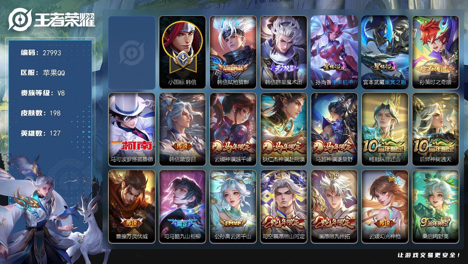 PX_2554385-实名:,可修改,贵族等级:,V4,英雄数:,127,皮肤数:,165,星传说:,幽冥之眼,传说皮:,冠军飞将,绛天战甲,久胜战神,地狱之眼,胖达荣荣,神骥·越千峰,限定皮:,高山流水,五谷丰年,鸣野蒿