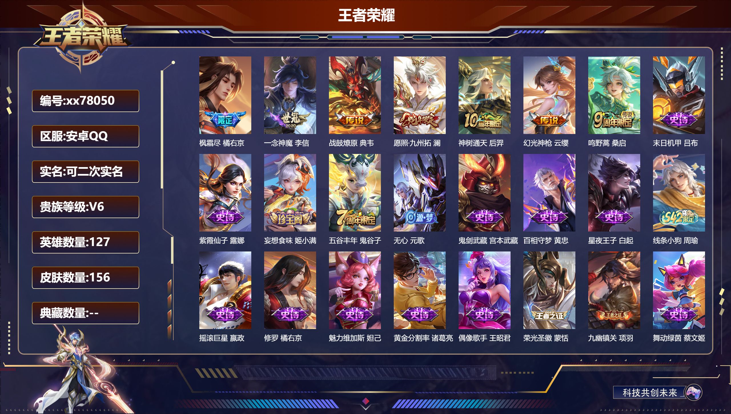 PX_2556575-,可二次,V6,贵族积分14036,安卓QQ/156皮肤/127英雄/0典藏/0珍品无双/0无双/0珍品传说/7传说/42史诗/7稀有英雄 【7,传说皮肤】,枫霜尽,橘右京,一念神魔,李信,战鼓燎原,典韦,愿照·九州拓,澜,神树通天,后羿,幻光神枪,云缨,鸣野蒿,桑启, 【42,史诗皮肤】,末日机甲,吕布,紫霞仙子,露娜,妄想食味,姬小满,五谷丰年,鬼谷子,无心,元歌,鬼剑武藏,宫本武藏,百相守梦,黄忠,星夜王子,白起,线条小狗,周瑜,摇滚巨星,嬴政,修罗,橘右京,魅力维加斯,妲己,黄金分割率,诸葛亮,偶像歌手,王昭君,荣光圣徽,蒙恬,九幽镇关,项羽,舞动绿茵,蔡文姬,鹰眼统帅,狄仁杰,孙行者,孙悟空,金属风暴,墨子,特工魅影,百里守约,逐浪之夏,李元芳,未来纪元,赵云,魔术师,狄仁杰,顽岩魄,蒙犽,皇家上将,赵云,天才门将,刘禅,破空之剑,亚连,圣诞狂欢,吕布,器灵·浮梦炉,赵怀真,夏日便利店,蔡文姬,火炮绅士,黄忠,节奏热浪,阿轲,曙光守护者,铠,心灵骇客,安琪拉,乱世虎臣,张飞,缤纷独角兽,小乔,百相守梦,百里守约,水果甜心,孙尚香,幽灵船长,曹操,乘风破浪,夏侯惇,暗隐猎兽者,兰陵王, 【79,勇者皮肤】,爱心护理,阿轲,沙漠行僧,达摩,大漠名商,沈梦溪,纽约教父,刘备,拳王,达摩,大发明家,达摩,龙舞盛年,沈梦溪,丁香结,小乔,幻夜卜梦,芈月,海盐诗旅,桑启,归虚梦演,孙膑,汉昭烈帝,刘备,白色死神,白起,黄金武士,典韦,阴阳师,狄仁杰,次元突破,哪吒,古海寻踪,张良,牛运亨通,牛魔,虎啸剑宗,刘邦,海滩派对,项羽,西部游侠,莱西奥,无双福将,程咬金,百相守梦,影,潮玩探月行,猪八戒,天穹祈灯,鬼谷子,决胜大满贯,曹操,阿尔法小队,后羿,次元傲视,杨戬,虹云星官,明世隐,救世之瞳,扁鹊,死亡骑士,亚瑟,玩偶对对碰,安琪拉,掌控之力,诸葛亮,海滩丽影,钟无艳,忍·炎影,赵云,雪境奇遇,西施,坚韧之力,苏烈,擒涛扼浪,裴擒虎,乓乓大师,鲁班大师,探海日志,鲁班大师,天使之翼,孙膑,雾都夜雨,干将莫邪,兔女郎,花木兰,龙腾万里,关羽,金庭之子,兰陵王,未来纪元,宫本武藏,荣光之誓,亚瑟,花好人间,甄姬,潮玩造梦师,刘备,秘密基地,刘禅,街头霸王,韩信,云中旅人,李元芳,妄想特派,李元芳,蔚蓝守将,蒙恬,契约魔法,米莱狄,命运加冕,露娜,午后时光,王昭君,灵野札记,张良,死霸装,白起,特工战影,狂铁,虚灵犬护,钟馗,神迹守卫,孙悟空,剑破天穹,刘邦,铁骨偃魂,典韦,苍林狼骑,苍,天穹之誓,姜子牙,星梦巡礼,姜子牙,谧流熔炉,太乙真人,夏日便利店,虞姬,鹤鸣心笺,艾琳,云械蓝图,云中君,逆浪荇歌,甄姬,线条小狗,周瑜,线条小狗,桑启,百相守梦,老夫子,噬灭天穹,东皇太一,灵卦秘语,少司缘,敬我三分,盘古,爆裂喵拳,达摩, 【29,其他皮肤】,前尘,金蝉,战争骑士,夏侯惇,潮流仙人,老夫子,第七人偶,干将莫邪,万圣前夜,小乔,海之征途,孙策,冰刃幻境,镜,碧珀绯影,暃,英喵野望,刘禅,花间舞,公孙离,修竹墨客,上官婉儿,范海辛,李白,维京掠夺者,苍,激情绿茵,马可波罗,埃及法老,杨戬,归虚梦演,西施,尼罗河女神,女娲,一千零一夜,张良,幸存者,马超,战争女神,雅典娜,创世神祝,盘古,特种部队,李元芳,蔷薇王座,蔡文姬,孤猎,澜,秩序猎龙将,蒙恬,精灵公主,王昭君,赤焰之缨,云缨,天启骑士,关羽,圆桌骑士,太乙真人, 【7,稀有英雄】,不知火舞,橘右京,夏洛特,娜可露露,韩信,艾琳,赵云, 营地ID:,