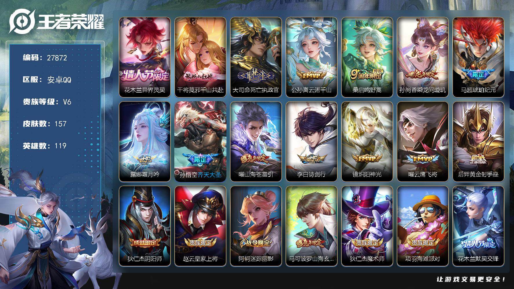PX_2556555-,可二次,V7,贵族积分47699,安卓QQ/240皮肤/128英雄/1典藏/0珍品无双/0无双/0珍品传说/4传说/64史诗/8稀有英雄 【1,星传说皮肤】,未来机甲,孙尚香, 【1,典藏皮肤】,赤影疾锋,关羽, 【4,传说皮肤】,地狱火,孙悟空,凤求凰,李白,地狱之眼,宫本武藏,末日机甲,孙尚香, 【64,史诗皮肤】,电玩小子,鲁班七号,白昼王子,嬴政,蔬乡物语,鲁班七号,紫霞仙子,露娜,高山流水,庄周,银河之约,李元芳,德古拉伯爵,刘邦,心灵战警,亚瑟,五谷丰年,鬼谷子,鬼剑武藏,宫本武藏,星夜王子,白起,线条小狗,周瑜,遇见飞天,杨玉环,摇滚巨星,嬴政,修罗,橘右京,魅力维加斯,妲己,黄金分割率,诸葛亮,偶像歌手,王昭君,女仆咖啡,妲己,舞动绿茵,蔡文姬,繁星吟游,蔡文姬,鹰眼统帅,狄仁杰,大圣娶亲,孙悟空,飞衡,韩信,孙行者,孙悟空,李小龙,裴擒虎,驯魔猎人,兰陵王,逐梦之影,韩信,傲雪梅枪,韩信,特工魅影,百里守约,猫狗日记,孙策,逐浪之夏,李元芳,未来纪元,赵云,鸭鸭历险记,刘禅,魔术师,狄仁杰,龙之律动,狂铁,皇家上将,赵云,冰冠公主,雅典娜,至尊宝,孙悟空,辉光之辰,后羿,功夫厨神,程咬金,梁祝,上官婉儿,天才门将,刘禅,云间偶戏,元歌,水晶猎龙者,花木兰,御风骁将,吕布,圣诞狂欢,吕布,白龙吟,韩信,冰雪圆舞曲,甄姬,青蛇,小乔,千年之狐,李白,青春决赛季,花木兰,青龙志,铠,心灵骇客,安琪拉,箭羽风息,伽罗,乱世虎臣,张飞,百相守梦,周瑜,缤纷独角兽,小乔,百相守梦,百里守约,水果甜心,孙尚香,江河有灵,阿古朵,幽灵船长,曹操,乘风破浪,夏侯惇,暗隐猎兽者,兰陵王, 【121,勇者皮肤】,胡桃夹子,干将莫邪,烛龙,曹操,爱心护理,阿轲,沙漠行僧,达摩,大漠名商,沈梦溪,纽约教父,刘备,拳王,达摩,大发明家,达摩,丁香结,小乔,功夫炙烤,廉颇,沉稳之力,孙尚香,海盐诗旅,桑启,朔风刀,夏侯惇,醍醐杖,老夫子,朔望之晖,女娲,归虚梦演,孙膑,汉昭烈帝,刘备,黑桃队长,鲁班七号,黄金武士,典韦,御旌,牛魔,阴阳师,狄仁杰,炼金王,扁鹊,次元突破,哪吒,古海寻踪,张良,功夫老勺,老夫子,西部大镖客,牛魔,鲨炮海盗猫,沈梦溪,海滩派对,项羽,完美运算,后羿,万华元夜,狄仁杰,踏浪烽翎,莱西奥,演武夺筹,程咬金,美猴王,孙悟空,猎兽之王,吕布,野性能量,吕布,守护之力,大乔,无双福将,程咬金,原初探秘者,鬼谷子,星空之诺,沈梦溪,潮玩探月行,猪八戒,天穹祈灯,鬼谷子,疑决卦,明世隐,化身博士,扁鹊,潮玩骑士王,亚瑟,五福同心,张飞,次元傲视,杨戬,星际陆战队,程咬金,幻乐之宴,鬼谷子,霸王丸,宫本武藏,虹云星官,明世隐,雾影缉谜,兰陵王,赤莲之焰,周瑜,死亡骑士,亚瑟,敏锐之力,李白,破局者,亚连,玩偶对对碰,安琪拉,掌控之力,诸葛亮,海滩丽影,钟无艳,狰,白起,雪境奇遇,西施,重明,芈月,坚韧之力,苏烈,万事如意,刘备,乓乓大师,鲁班大师,妖精王,孙膑,探海日志,鲁班大师,天使之翼,孙膑,雾都夜雨,干将莫邪,玩趣恶龙,高渐离,兔女郎,花木兰,龙腾万里,关羽,金庭之子,兰陵王,罗小黑战记,哪吒,千军破阵,苏烈,零食大作战,姬小满,荣光之誓,亚瑟,万象初新,宫本武藏,御銮,盾山,时尚教父,姜子牙,春野之旅,钟无艳,秘密基地,刘禅,穷奇,典韦,教廷特使,韩信,街头霸王,韩信,云中旅人,李元芳,妄想特派,李元芳,西部大镖客,孙悟空,凯尔特女王,虞姬,进击墨子号,墨子,少女阿狸,妲己,混沌棋,弈星,御霄,米莱狄,春野闲踪,苏烈,布丁狗之约,阿古朵,命运加冕,露娜,小满鸭,姬小满,灵野札记,张良,驱傩正仪,钟馗,神迹守卫,钟馗,鸭鸭历险记,沈梦溪,死霸装,白起,虚灵犬护,钟馗,御狮,狂铁,班班快跑,鲁班七号,漠中幻影,嫦娥,饕餮,太乙真人,劲辣红锅,太乙真人,苍威无极,项羽,熔金海岸,周瑜,苍林狼骑,苍,星梦巡礼,姜子牙,谧流熔炉,太乙真人,暗都幽影,大司命,鹤鸣心笺,艾琳,锦麟游梦,庄周,逆浪荇歌,甄姬,百相守梦,孙策,线条小狗,周瑜,百相守梦,老夫子,噬灭天穹,东皇太一,敬我三分,盘古, 【52,其他皮肤】,伊势巫女,大乔,前尘,金蝉,芝加哥教父,黄忠,潮流仙人,老夫子,三太子,哪吒,棒球奇才,沈梦溪,龙域领主,铠,生化警戒,钟无艳,死神来了,曹操,超能战警,曹操,花见巫女,伽罗,爱与和平,苏烈,第七人偶,干将莫邪,万圣前夜,小乔,灼热之刃,李信,熊喵少女,阿古朵,海之征途,孙策,福禄兄弟,鲁班七号,帝国元帅,项羽,精灵王,后羿,星航指挥官,诸葛亮,魇语军师,司马懿,英喵野望,刘禅,午夜歌剧院,元歌,隐刃,兰陵王,花间舞,公孙离,异域舞娘,貂蝉,街头旋风,裴擒虎,东海龙王,东皇太一,修竹墨客,上官婉儿,剑舞者,花木兰,范海辛,李白,维京掠夺者,苍,归虚梦演,蒙犽,激情绿茵,马可波罗,埃及法老,杨戬,归虚梦演,西施,画中游,桑启,年年有余,猪八戒,一千零一夜,张良,创世神祝,盘古,绝影神枪,百里守约,蔷薇王座,蔡文姬,森,瑶,孤猎,澜,踏雪寻梅,弈星,精准探案法,米莱狄,赤焰之缨,云缨,露花倒影,嫦娥,地府判官,钟馗,天启骑士,关羽,西部大镖客,孙悟空, 【8,稀有英雄】,嬴政,不知火舞,橘右京,夏洛特,娜可露露,韩信,艾琳,赵云, 营地ID:,