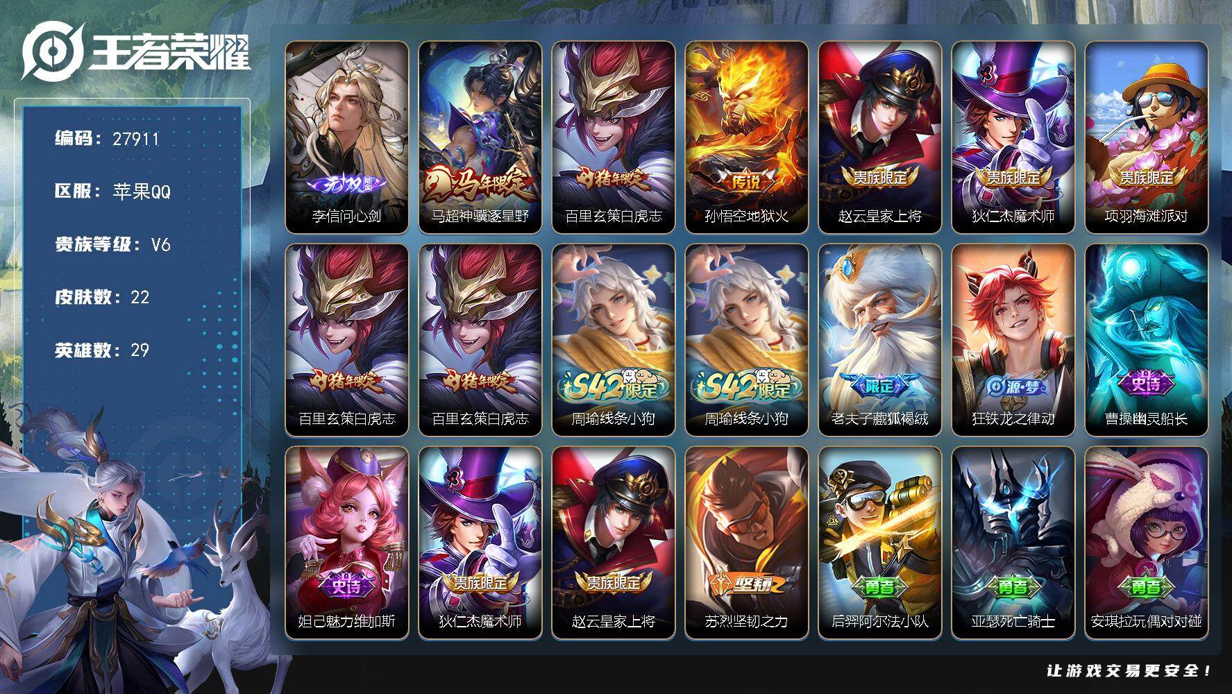 PX_2539627-可换绑【精品小号·李信无双·马超马限·白虎志·藏狐褐绒·】1按键,五级铭文4,无二次苹果Q-V6-22皮肤-1无双-3传说-6史诗【无双皮肤】:李信问心剑【传说皮肤】:马超神骥逐星野,百里玄策白虎志,孙悟空地狱火【限定皮肤】:赵云皇家上将,狄仁杰魔术师,项羽海滩派对,百里玄策白虎志【年限皮肤】:百里玄策白虎志【战令限定】:周瑜线条小狗【史诗皮肤】:周瑜线条小狗,老夫子藏狐褐绒,狂铁龙之律动,曹操幽灵船长,妲己魅力维加斯,狄仁杰魔术师,赵云皇家上将【其他皮肤】:苏烈坚韧之力,后羿阿尔法小队,亚瑟死亡骑士,安琪拉玩偶对对碰,赵云忍炎影,项羽海滩派对,云缨赤焰之缨,司空震启蛰,梦奇美梦成真,百里玄策威尼斯狂欢,铠龙域领主