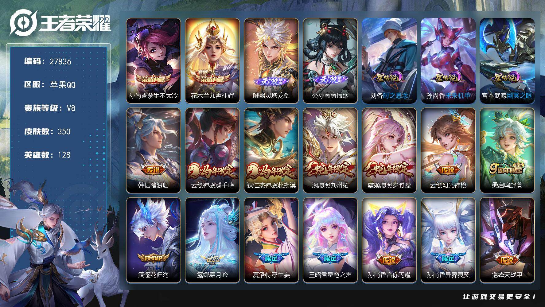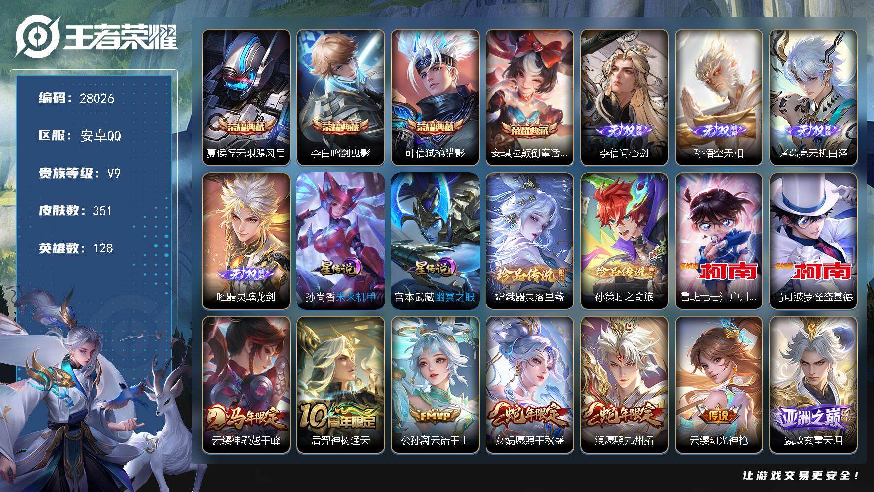 PX_2542654-可换绑【精品v10号·5典藏·1无双·1珍品·蛇年全套·龙年全套·白虎志·武陵仙君·凤求凰·5星元·1限定天幕·贵族积分19w】,143戳戳,336幸运值,24按键,1天幕,4星传说,19王者印记,满级铭文,无二次安卓Q-V10-430皮肤-5典藏皮肤-1无双-1珍品传说-42传说-129史诗【英雄全皮】嬴政全皮,孙权全皮,苍全皮,敖隐全皮,司空震全皮,影全皮【荣耀典藏】:夏侯惇无限飓风号,孙尚香杀手不太冷,李白鸣剑曳影,花木兰九霄神辉,韩信弑枪猎【无双皮肤】:李白碎月剑心【珍品传说】:马可波罗怪盗基德【星元皮肤】:鲁班七号寅虎焰心,狄仁杰星际治安官,孙悟空幽冥火,宫本武藏幽冥之眼,貂蝉金色仲夏夜【天幕】:妄想时刻天幕【传说皮肤】:后羿神树通天,杨玉环星之鸣奏,司空震愿照山河定,女娲愿照千秋盛,妲己愿照众生和,澜愿照九州拓,蔡文姬愿照福禄聚,虞姬愿照岁时盈,云缨幻光神枪,裴擒虎祥瑞亨通,嬴政玄雷天君,桑启鸣野蒿,孙尚香乘龙问璇玑,孙策乘龙淬吴钩,赵云乘龙铭钟鼎,艾琳觅芳踪,夏洛特浮生妄,李信山海炽霜斩,不知火舞绯月行,赵云淬星耀世,小乔音你心动,李元芳飞鸢探春,公孙离祈雪灵祝,诸葛亮时雨天司,镜炽阳神光,虞姬启明星使,关羽武圣,曜云鹰飞将,伽罗太华,干将莫邪久胜战神,虞姬云霓雀翎,百里玄策白虎志,花木兰冠军飞将,后羿黄金射手座,杨戬永曜之星,诸葛亮武陵仙君,貂蝉仲夏夜之梦,李白凤求凰,宫本武藏地狱之眼,孙悟空地狱火,吕布天魔缭乱,狄仁杰超时空战士【限定皮肤】:白起狰,李白谪仙醉月,狄仁杰阴阳师,虞姬凯尔特女王,赵云皇家上将,墨子神迹守卫,嬴政优雅恋人,嬴政白昼王子,鲁班七号狮舞东方,庄周玄嵩,高渐离死亡摇滚,阿轲迷踪丽影,孙膑妖精王,扁鹊炼金王,芈月重明,吕布天魔缭乱,吕布猎兽之王,吕布御风骁将,周瑜赤莲之焰,元歌云间偶戏,夏侯惇朔风刀,甄姬幽恒,曹操烛龙,典韦穷奇,典韦蓝屏警告,典韦岱宗,马可波罗逐梦之星,马可波罗暗影游猎,狄仁杰魔术师,狄仁杰万华元夜,达摩星际陆战队,项羽海滩派对,老夫子醍醐杖,老夫子航海奇遇记,关羽冰锋战神,关羽武圣,程咬金演武夺筹,露娜一生所爱,刘邦夺宝奇兵,韩信逐梦之影,韩信飞衡,王昭君凤凰于飞,兰陵王驯魔猎人,花木兰瑞麟志,花木兰默契交锋,不知火舞绯月行,亚瑟潮玩骑士王,孙悟空至尊宝,牛魔御旌,牛魔奔雷神使,后羿辉光之辰,张飞虎魄,李元芳银河之约,李元芳云中旅人,虞姬启明星使,钟馗神迹守卫,钟馗驱傩正仪,杨玉环遇见飞天,杨戬永曜之星,女娲朔望之晖,干将莫邪冰霜恋舞曲,雅典娜单词大作战,雅典娜黎明之约,蔡文姬繁星吟游,太乙真人饕餮,太乙真人华丽摇滚,鬼谷子原初探秘者,诸葛亮武陵仙君,诸葛亮时雨天司,黄忠烈魂,铠青龙志,百里玄策白虎志,百里玄策原初追逐者,弈星混沌棋,公孙离祈雪灵祝,沈梦溪星空之诺,明世隐疑决卦,裴擒虎天狼狩猎者,裴擒虎李小龙,狂铁御狮,米莱狄御霄,米莱狄胡桃异想国,云中君纤云弄巧,李信山海炽霜斩,伽罗太华,伽罗天狼溯光者,盾山御銮,猪八戒西部大镖客,上官婉儿梁祝,嫦娥拒霜思,蒙犽狂想玩偶喵,鲁班大师探海日志,桑启海盐诗旅,夏洛特浮生妄,暃星界游侠,艾琳流音漫舞,司空震地狱燃心,阿古朵江河有灵,张良古海寻踪,蒙犽百解令,艾琳觅芳踪,蒙恬荣光圣徽,高渐离燃音魔法,妲己灵卜魔法,鬼谷子天穹祈灯,李白碎月剑心,伽罗琥珀纪元,姬小满妄想食味,大乔乘龙忆丹青,安琪拉乘龙聚宝船,孙尚香乘龙问璇玑,孙策乘龙淬吴钩,赵云乘龙铭钟鼎,沈梦溪龙舞盛年,刘邦剑破天穹,项羽苍威无极【年限皮肤】:王昭君凤凰于飞,李白凤求凰,杨戬永曜之星,后羿辉光之辰,花木兰瑞麟志,百里玄策白虎志,铠青龙志,庄周玄嵩,甄姬幽恒,伽罗太华,典韦岱宗,韩信飞衡,公孙离祈雪灵祝,诸葛亮时雨天司,吕布御风骁将,牛魔奔雷神使,李信山海炽霜斩,孙尚香乘龙问璇玑,孙策乘龙淬吴钩,赵云乘龙铭钟鼎,大乔乘龙忆丹青,安琪拉乘龙聚宝船,司空震愿照山河定,女娲愿照千秋盛,妲己愿照众生和,澜愿照九州拓,蔡文姬愿照福禄聚,虞姬愿照岁时盈【赛季限定】:孙膑妖精王,扁鹊炼金王,虞姬凯尔特女王,白起狰,太乙真人饕餮,曹操烛龙,芈月重明,典韦穷奇,狂铁御狮,米莱狄御霄,牛魔御旌,盾山御銮,夏侯惇朔风刀,弈星混沌棋,明世隐疑决卦,老夫子醍醐杖,鬼谷子原初探秘者,狄仁杰万华元夜,程咬金演武夺筹,钟馗驱傩正仪,李元芳云中旅人,桑启海盐诗旅,鲁班大师探海日志,张良古海寻踪,鬼谷子天穹祈灯,刘邦剑破天穹,东皇太一噬灭天穹,太乙真人谧流熔炉,钟馗虚灵犬护,甄姬逆浪荇歌,亚瑟荣光之誓,百里玄策原初追逐者,雅典娜黎明之约,蒙恬荣光圣徽,牛魔星界战将,项羽九幽镇关【战令限定】:嬴政白昼王子,吕布猎兽之王,典韦蓝屏警告,女娲朔望之晖,鲁班七号狮舞东方,钟馗神迹守卫,兰陵王驯魔猎人,周瑜赤莲之焰,李元芳银河之约,沈梦溪星空之诺,阿轲迷踪丽影,刘邦夺宝奇兵,马可波罗暗影游猎,猪八戒西部大镖客,蒙犽狂想玩偶喵,雅典娜单词大作战,元歌云间偶戏,亚瑟潮玩骑士王,米莱狄胡桃异想国,达摩星际陆战队,老夫子航海奇遇记,墨子神迹守卫,暃星界游侠,司空震地狱燃心,艾琳流音漫舞,高渐离燃音魔法,妲己灵卜魔法,项羽苍威无极,亚连破空之剑,廉颇撼地雄心,孙悟空神迹守卫,百里守约百相守梦,老夫子百相守梦,孙膑茶境仙,马超访茗客,刘禅鸭鸭历险记,