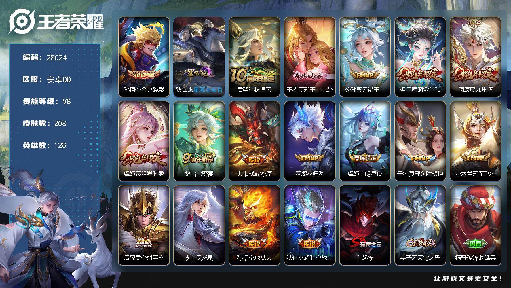 PX_2538164-可换绑【捡漏精品号·孙悟空典藏·蛇年限定·凤求凰·多传说限定号】1星传说,17按键,8王者印记,五级铭文100,无二次,安卓Q-V8-208皮肤-1典藏皮肤-16传说-42史诗【荣耀典藏】:孙悟空全息碎影【星元皮肤】:狄仁杰星际治安官【传说皮肤】:后羿神树通天,干将莫邪千山共赴,公孙离云诺千山,妲己愿照众生和,澜愿照九州拓,虞姬愿照岁时盈,桑启鸣野蒿,典韦战鼓燎原,澜逐花归海,虞姬启明星使,干将莫邪久胜战神,花木兰冠军飞将,后羿黄金射手座,李白凤求凰,孙悟空地狱火,狄仁杰超时空战士【限定皮肤】:白起狰,姜子牙天穹之誓,杨戬破阵退雄兵,狄仁杰阴阳师,虞姬凯尔特女王,赵云皇家上将,赵云引擎之心,扁鹊炼金王,芈月重明,元歌云间偶戏,夏侯惇朔风刀,曹操烛龙,典韦穷奇,狄仁杰魔术师,狄仁杰万华元夜,达摩沙漠行僧,项羽海滩派对,老夫子醍醐杖,韩信逐梦之影,兰陵王金庭之子,孙悟空至尊宝,牛魔御旌,虞姬启明星使,太乙真人饕餮,鬼谷子原初探秘者,弈星混沌棋,沈梦溪大漠名商,明世隐疑决卦,裴擒虎李小龙,狂铁御狮,米莱狄御霄,鲁班大师探海日志,桑启海盐诗旅,张良古海寻踪,姬小满妄想食味,刘邦剑破天穹,镜青焰无极,周瑜熔金海岸【年限皮肤】:李白凤求凰,妲己愿照众生和,澜愿照九州拓,虞姬愿照岁时盈【赛季限定】:扁鹊炼金王,虞姬凯尔特女王,白起狰,太乙真人饕餮,曹操烛龙,芈月重明,典韦穷奇,狂铁御狮,米莱狄御霄,牛魔御旌,夏侯惇朔风刀,弈星混沌棋,明世隐疑决卦,老夫子醍醐杖,鬼谷子原初探秘者,狄仁杰万华元夜,达摩沙漠行僧,兰陵王金庭之子,沈梦溪大漠名商,桑启海盐诗旅,鲁班大师探海日志,张良古海寻踪,刘邦剑破天穹,姜子牙天穹之誓,东皇太一噬灭天穹,太乙真人谧流熔炉,钟馗虚灵犬护,甄姬逆浪荇歌,亚瑟荣光之誓,牛魔星界战将,项羽九幽镇关【战令限定】:元歌云间偶戏,镜青焰无极,百里守约百相守梦,老夫子百相守梦,刘禅鸭鸭历险记,沈梦溪鸭鸭历险记,周瑜百相守梦,孙策百相守梦,周瑜线条小狗【史诗皮肤】:周瑜线条小狗,项羽九幽镇关,公孙离涂山容容,黄忠百相守梦,周瑜百相守梦,百里守约雪豹霜爪,狂铁龙之律动,刘禅鸭鸭历险记,阿轲化蝶舞,牛魔星界战将,百里守约百相守梦,马可波罗星界特工,镜青焰无极,姬小满妄想食味,安琪拉时之奇旅,元歌云间偶戏,裴擒虎李小龙,不知火舞魅语,娜可露露晚萤,狄仁杰鹰眼统帅,伽罗箭羽风息,孙策猫狗日记,阿轲节奏热浪,安琪拉心灵骇客,兰陵王暗隐猎兽者,韩信逐梦之影,赵云引擎之心,孙悟空至尊宝,韩信白龙吟,曹操幽灵船长,墨子金属风暴,妲己女仆咖啡,妲己魅力维加斯,嬴政摇滚巨星,孙尚香水果甜心,宫本武藏鬼剑武藏,狄仁杰魔术师,王昭君偶像歌手,赵云未来纪元,赵云皇家上将,阿轲暗夜猫娘,露娜紫霞仙子,项羽苍穹之光 【其他皮肤】:影百相守梦,兰陵王雾影缉谜,桑启线条小狗,蚩奼极光幻客,艾琳鹤鸣心笺,亚瑟荣光之誓,哪吒罗小黑战记,鬼谷子克喵,莱西奥踏浪烽翎,孙策百相守梦,云中君云械蓝图,甄姬逆浪荇歌,露娜命运加冕,张良灵野札记,小乔秘证寻踪,苏烈春野闲踪,沈梦溪鸭鸭历险记,钟馗虚灵犬护,刘备浪漫序章,戈娅玫蓝誓约,姜子牙星梦巡礼,典韦铁骨偃魂,太乙真人谧流熔炉,苍苍林狼骑,干将莫邪雾都夜雨,老夫子百相守梦,东皇太一噬灭天穹,盘古敬我三分,周瑜熔金海岸,姜子牙天穹之誓,杨戬破阵退雄兵,大司命暗都幽影,刘邦剑破天穹,廉颇功夫炙烤,亚连破局者,张良古海寻踪,李元芳妄想特派,鲁班大师探海日志,牛魔牛运亨通,猪八戒潮玩探月行,桑启海盐诗旅,沈梦溪大漠名商,兰陵王金庭之子,程咬金无双福将,达摩沙漠行僧,马可波罗潮玩牛仔,鲁班大师乓乓大师,露娜瓷语鉴心,刘禅秘密基地,狄仁杰万华元夜,鬼谷子原初探秘者,廉颇无尽征程,老夫子醍醐杖,盾山圆桌骑士,明世隐疑决卦,哪吒次元突破,弈星混沌棋,夏侯惇朔风刀,沈梦溪鲨炮海盗猫,小乔丁香结,牛魔御旌,庄周奇妙博物学,明世隐虹云星官,米莱狄御霄,项羽科学大爆炸,安琪拉如懿,狂铁御狮,鬼谷子幻乐之宴,李白敏锐之力,诸葛亮掌控之力,典韦穷奇,孙尚香沉稳之力,牛魔制霸全明星,老夫子功夫老勺,狂铁命运角斗场,芈月重明,王昭君幻想奇妙夜,曹操烛龙,宫本武藏霸王丸,太乙真人饕餮,钟无艳海滩丽影,白起狰,虞姬凯尔特女王,关羽龙腾万里,扁鹊炼金王,刘备汉昭烈帝,刘备纽约教父,狄仁杰阴阳师,后羿阿尔法小队,宫本武藏万象初新,甄姬花好人间,张飞五福同心,花木兰兔女郎,达摩拳王,亚瑟死亡骑士,妲己少女阿狸,扁鹊救世之瞳,扁鹊化身博士,白起白色死神,赵云忍炎影,赵云白执事,阿轲爱心护理,阿轲致命风华,韩信街头霸王,韩信教廷特使,项羽海滩派对,暃碧珀绯影,云缨赤焰之缨,澜孤猎,蒙恬秩序猎龙将,镜冰刃幻境,马超幸存者,盘古创世神祝,嫦娥露花倒影,上官婉儿修竹墨客,伽罗花见巫女,司马懿魇语军师,孙策海之征途,元歌午夜歌剧院,米莱狄精准探案法,裴擒虎街头旋风,明世隐占星师,女娲尼罗河女神,苏烈爱与和平,百里守约绝影神枪,铠龙域领主,干将莫邪第七人偶,东皇太一东海龙王,大乔伊势巫女,黄忠芝加哥教父,诸葛亮星航指挥官,哪吒三太子,杨戬埃及法老,苍维京掠夺者,雅典娜战争女神,关羽天启骑士,刘邦圣殿之光,钟馗地府判官,李白范海辛,兰陵王隐刃,刘禅英喵野望,周瑜海军大将,孙悟空西部大镖客,小乔