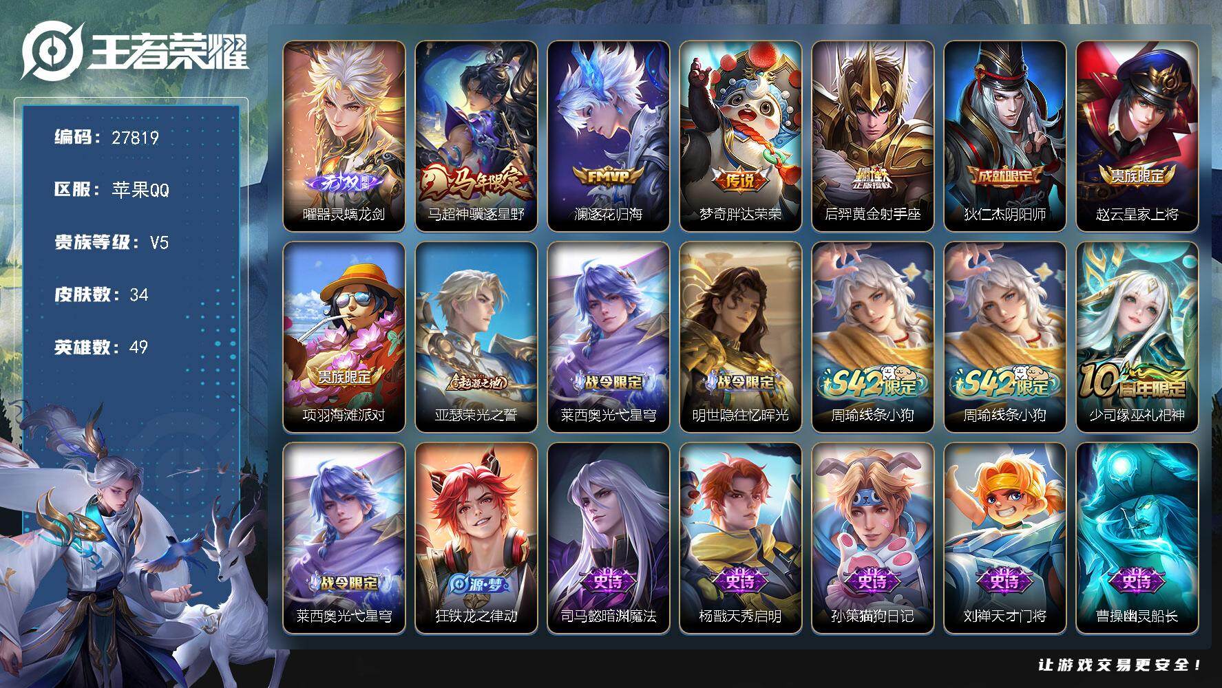 PX_2537887-可换绑,【精品小号·无双曜·马限马超·】2按键,2王者印记,五级铭文20,无二次苹果Q-V5-34皮肤-1无双-4传说-14史诗【无双皮肤】:曜器灵螭龙剑【传说皮肤】:马超神骥逐星野,澜逐花归海,梦奇胖达荣荣,后羿黄金射手座【限定皮肤】:狄仁杰阴阳师,赵云皇家上将,项羽海滩派对【赛季限定】:亚瑟荣光之誓【战令限定】:莱西奥光弋星穹,明世隐往忆晖光,周瑜线条小狗【史诗皮肤】:周瑜线条小狗,少司缘巫礼祀神,莱西奥光弋星穹,狂铁龙之律动,司马懿暗渊魔法,杨戬天秀启明,孙策猫狗日记,刘禅天才门将,曹操幽灵船长,墨子金属风暴,妲己魅力维加斯,孙尚香水果甜心,王昭君偶像歌手,赵云未来纪元,赵云皇家上将【其他皮肤】:蚩奼极光幻客,曹操逐霄之志,明世隐往忆晖光,亚瑟荣光之誓,狄仁杰阴阳师,甄姬花好人间,亚瑟死亡骑士,白起白色死神,赵云忍炎影,韩信街头霸王,项羽海滩派对,马超幸存者,曜归虚梦演,兰陵王隐刃