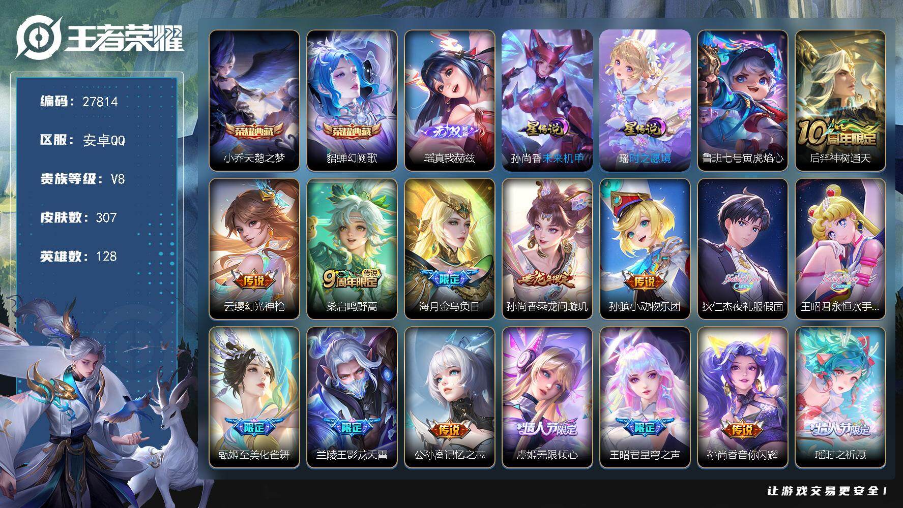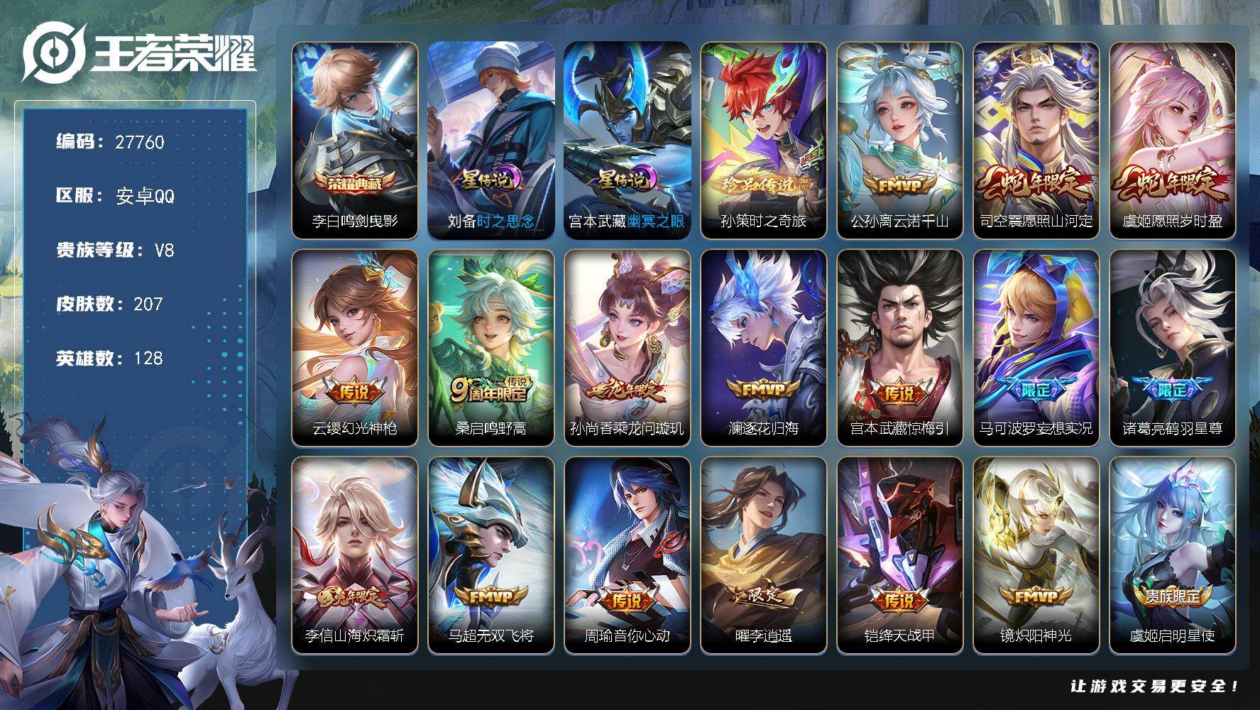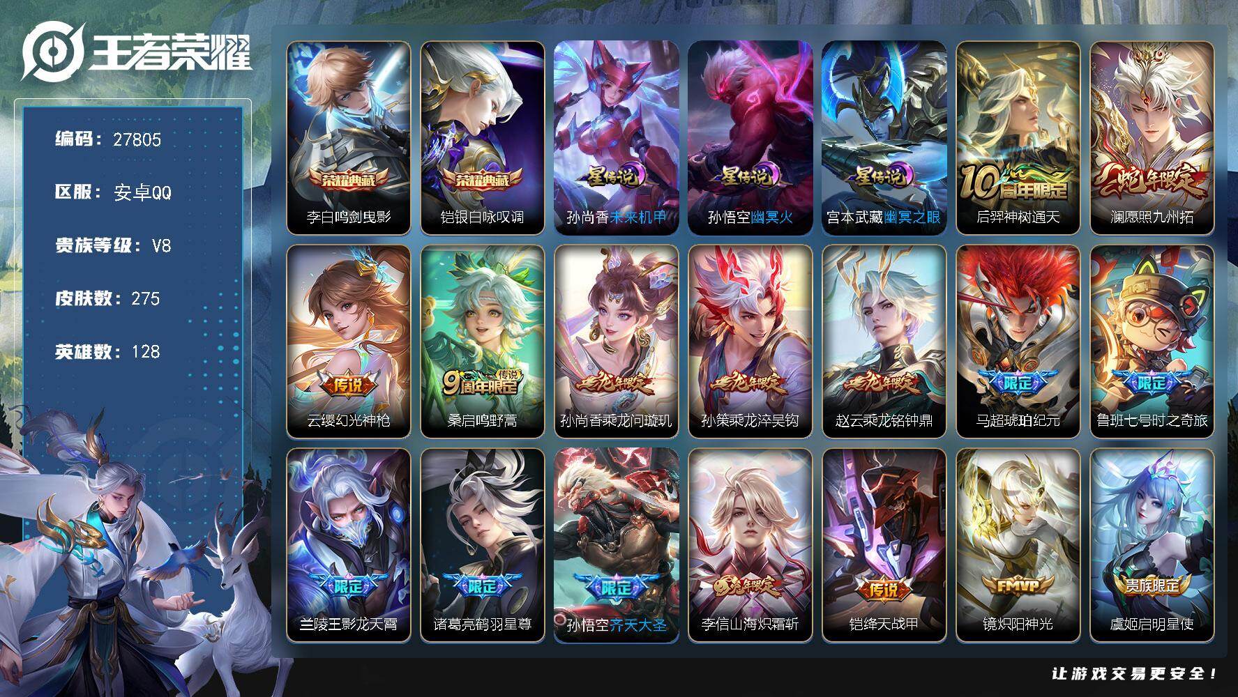 PX_2556547-,不包人脸,V9,贵族积分,安卓QQ/442皮肤/128英雄/3典藏/0珍品无双/2无双/4珍品传说/42传说/121史诗/8稀有英雄 【3,星传说皮肤】,时之思念,刘备,未来机甲,孙尚香,幽冥之眼,宫本武藏, 【4,珍品传说】,酷洛米之心,安琪拉,朽木白哉,暃,怪盗基德,马可波罗,器灵·落星盏,嫦娥, 【3,典藏皮肤】,天鹅之梦,小乔,银白咏叹调,铠,九霄神辉,花木兰, 【2,无双皮肤】,问心剑,李信,无相,孙悟空, 【42,传说皮肤】,枫霜尽,橘右京,胖达荣荣,梦奇,星穹之声,王昭君,启明星使,虞姬,碎云,百里守约,逐花归海,澜,电玩·雷克斯,澜,飞鸢探春,李元芳,无双飞将,马超,白虎志,百里玄策,死亡执政官,大司命,深海之息,马可波罗,永曜之星,杨戬,凤求凰,李白,诗剑行,李白,浮生妄,夏洛特,落雪白狼,亚连,神骥·逐星野,马超,地狱之眼,宫本武藏,祈雪灵祝,公孙离,炽阳神光,镜,黄金射手座,后羿,无限倾心,项羽,时之恋人,刘备,黄金狮子座,达摩,末日机甲,孙尚香,乘龙·淬吴钩,孙策,山海·炽霜斩,李信,一念神魔,李信,画中仙,干将莫邪,乘龙·铭钟鼎,赵云,山海·苍雷引,曜,黄金白羊座,张良,愿照·九州拓,澜,愿照·众生和,妲己,愿照·福禄聚,蔡文姬,幻光神枪,云缨,愿照·山河定,司空震,祥瑞亨通,裴擒虎,愿照·岁时盈,虞姬,愿照·千秋盛,女娲,鸣野蒿,桑启, 【121,史诗皮肤】,电玩小子,鲁班七号,末日机甲,吕布,蔬乡物语,鲁班七号,紫霞仙子,露娜,百解令,蒙犽,暗影游猎,马可波罗,燃音魔法,高渐离,天秀·启明,杨戬,猫狗日记,大乔,妄想食味,姬小满,糖绘人间,亚连,德古拉伯爵,刘邦,心灵战警,亚瑟,五谷丰年,鬼谷子,无心,元歌,巫礼祀神,少司缘,鬼剑武藏,宫本武藏,百相守梦,黄忠,星夜王子,白起,守夜人,弈星,地狱燃心,司空震,线条小狗,周瑜,百晓客,明世隐,摇滚巨星,嬴政,电玩高手,狂铁,顽趣,梦奇,修罗,橘右京,拒霜思,嫦娥,魅力维加斯,妲己,黄金分割率,诸葛亮,乐园奇幻夜,钟馗,偶像歌手,王昭君,荣光圣徽,蒙恬,女仆咖啡,妲己,赏金猎手,澜,九幽镇关,项羽,星界游侠,暃,晚萤,娜可露露,遇见神鹿,瑶,舞动绿茵,蔡文姬,繁星吟游,蔡文姬,暗夜贵公子,嬴政,鹰眼统帅,狄仁杰,胡桃异想国,米莱狄,飞衡,韩信,孙行者,孙悟空,李小龙,裴擒虎,光弋星穹,莱西奥,纤云弄巧,云中君,金属风暴,墨子,逐梦之影,韩信,特工魅影,百里守约,猫狗日记,孙策,原初追逐者,百里玄策,逐浪之夏,李元芳,奇幻香踪,扁鹊,未来纪元,赵云,灵蛊蚀心,扁鹊,朱雀志,百里守约,黎明之约,雅典娜,石田雨龙,后羿,鸭鸭历险记,刘禅,驭风魔法,戈娅,魔术师,狄仁杰,龙之律动,狂铁,顽岩魄,蒙犽,皇家上将,赵云,至尊宝,孙悟空,辉光之辰,后羿,战舞者,姬小满,功夫厨神,程咬金,梁祝,上官婉儿,天才门将,刘禅,圣诞恋歌,貂蝉,云间偶戏,元歌,水晶猎龙者,花木兰,破空之剑,亚连,心动手记,海诺,御风骁将,吕布,圣诞狂欢,吕布,青焰无极,镜,魅语,不知火舞,浮梦罗烟,海月,器灵·浮梦炉,赵怀真,奇遇星旅,桑启,浮光幕影,芈月,罗小黑战记,百里玄策,夏日便利店,蔡文姬,岱宗,典韦,星界战将,牛魔,永昼,夏洛特,地狱岩魂,廉颇,茶境仙,孙膑,冰雪圆舞曲,甄姬,青蛇,小乔,月团寄思,沈梦溪,航海奇遇记,老夫子,千年之狐,李白,节奏热浪,阿轲,暗夜猫娘,阿轲,织梦人,西施,曙光守护者,铠,心灵骇客,安琪拉,箭羽风息,伽罗,乱世虎臣,张飞,百相守梦,周瑜,龙胆,赵云,绅士熊喵,刘禅,缤纷独角兽,小乔,魔法小厨娘,安琪拉,陌上桑,艾琳,百相守梦,百里守约,线条小狗,小乔,炽弈燎原,弈星,水果甜心,孙尚香,狂想玩偶喵,蒙犽,化蝶舞,阿轲,江河有灵,阿古朵,幽灵船长,曹操,乘风破浪,夏侯惇,暗隐猎兽者,兰陵王, 【193,勇者皮肤】,时空谍影,海诺,玲珑珍味,西施,胡桃夹子,干将莫邪,圆桌骑士,盾山,爱心护理,阿轲,太极少年,赵怀真,星际陆战队,达摩,沙漠行僧,达摩,大漠名商,沈梦溪,暖冬絮语,程咬金,缤纷绘卷,张良,纽约教父,刘备,拳王,达摩,大发明家,达摩,龙舞盛年,沈梦溪,乐园追猎者,白起,丁香结,小乔,功夫炙烤,廉颇,沉稳之力,孙尚香,爱与正义,程咬金,海盐诗旅,桑启,幻泉雾影,海月,醍醐杖,老夫子,朔望之晖,女娲,归虚梦演,孙膑,汉昭烈帝,刘备,白色死神,白起,黄金武士,典韦,王牌新星,海月,阴阳师,狄仁杰,径山谋武,孙权,次元突破,哪吒,古海寻踪,张良,牛运亨通,牛魔,科学大爆炸,项羽,戏梦巡演,空空儿,功夫老勺,老夫子,西部大镖客,牛魔,鲨炮海盗猫,沈梦溪,虎啸剑宗,刘邦,海滩派对,项羽,完美运算,后羿,万华元夜,狄仁杰,无尽征程,廉颇,克喵,鬼谷子,踏浪烽翎,莱西奥,演武夺筹,程咬金,红桃皇后,芈月,西部游侠,莱西奥,野性能量,吕布,哥特玫瑰,露娜,守护之力,大乔,无双福将,程咬金,瓷语鉴心,露娜,百相守梦,影,原初探秘者,鬼谷子,星空之诺,沈梦溪,潮玩探月行,猪八戒,鸿运当头,亚瑟,天穹祈灯,鬼谷子,决胜大满贯,曹操,西部大镖客,猪八戒,疑决卦,明世隐,化身博士,扁鹊,潮玩骑士王,亚瑟,阿尔法小队,后羿,无尽旅途,扁鹊,五福同心,张飞,金色潮汐,朵莉亚,星际陆战队,程咬金,幻乐之宴,鬼谷子,虹云星官,明世隐,雾影缉谜,兰陵王,潮玩牛仔,马可波罗,救世之瞳,扁鹊,赤刃凌霄,敖隐,潮玩骑兵,杨戬,死亡骑士,亚瑟,浪漫序章,刘备,敏锐之力,李白,危途狂花,戈娅,破局者,亚连,幽兰居士,张良,玩偶对对碰,安琪拉,掌控之力,诸葛亮,海滩丽影,钟无艳,落日弦歌,高渐离,忍·炎影,赵云,雪境奇遇,西施,炽热元素使,姜子牙,坚韧之力,苏烈,唤灵魔甲,刘禅,万事