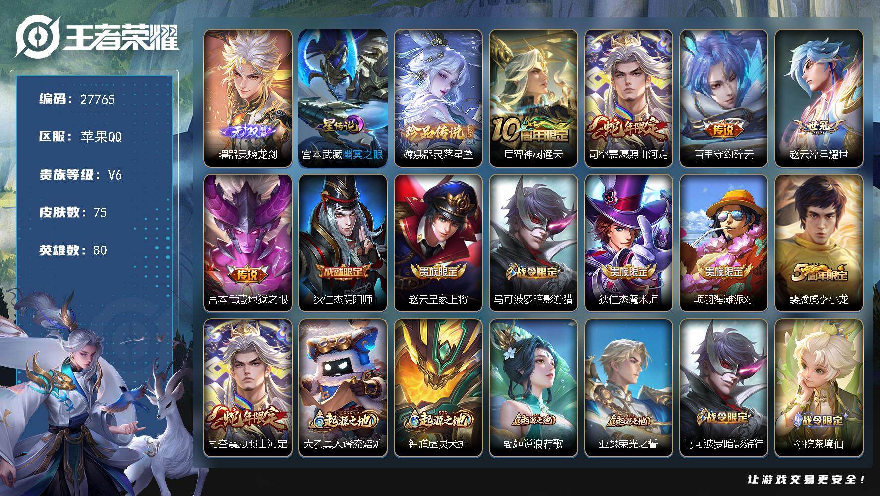 PX_2537859-可换绑【精品小号·曜无双·嫦娥珍品·司空震蛇限·浮梦炉·无二次】4按键,1星传说,1王者印记,五级铭文40,无二次苹果Q-V6-75皮肤-1无双-1珍品传说-5传说-22史诗【无双皮肤】:曜器灵螭龙剑【珍品传说】:嫦娥器灵落星盏【星元皮肤】:宫本武藏幽冥之眼【传说皮肤】:后羿神树通天,司空震愿照山河定,百里守约碎云,赵云淬星耀世,宫本武藏地狱之眼【限定皮肤】:狄仁杰阴阳师,赵云皇家上将,马可波罗暗影游猎,狄仁杰魔术师,项羽海滩派对,裴擒虎李小龙【年限皮肤】:司空震愿照山河定【赛季限定】:太乙真人谧流熔炉,钟馗虚灵犬护,甄姬逆浪荇歌,亚瑟荣光之誓【战令限定】:马可波罗暗影游猎,孙膑茶境仙,马超访茗客,周瑜线条小狗【史诗皮肤】:周瑜线条小狗,黄忠百相守梦,狂铁龙之律动,赵怀真器灵浮梦炉,孙膑茶境仙,裴擒虎李小龙,马可波罗暗影游猎,橘右京修罗,狄仁杰鹰眼统帅,白起星夜王子,程咬金功夫厨神,雅典娜冰冠公主,兰陵王暗隐猎兽者,小乔缤纷独角兽,花木兰水晶猎龙者,张飞乱世虎臣,墨子金属风暴,妲己女仆咖啡,妲己魅力维加斯,孙尚香水果甜心,宫本武藏鬼剑武藏,狄仁杰魔术师,赵云皇家上将【其他皮肤】:虞姬溯影追猎,艾琳鹤鸣心笺,亚瑟荣光之誓,哪吒罗小黑战记,鬼谷子克喵,莱西奥踏浪烽翎,甄姬逆浪荇歌,苏烈春野闲踪,钟馗虚灵犬护,刘备浪漫序章,戈娅玫蓝誓约,明世隐景韶洛都,姜子牙星梦巡礼,马超访茗客,太乙真人谧流熔炉,盘古重装意志,小乔丁香结,大乔守护之力,李白敏锐之力,诸葛亮掌控之力,孙尚香沉稳之力,狂铁命运角斗场,狄仁杰阴阳师,刘备万事如意,甄姬花好人间,亚瑟死亡骑士,典韦黄金武士,妲己少女阿狸,姜子牙时尚教父,宫本武藏未来纪元,韩信街头霸王,项羽海滩派对,盘古创世神祝,李信灼热之刃,裴擒虎街头旋风,杨玉环霓裳曲,苏烈爱与和平,百里守约绝影神枪,铠龙域领主,干将莫邪第七人偶,黄忠芝加哥教父,夏侯惇战争骑士,李白范海辛,兰陵王隐刃,孙悟空西部大镖客