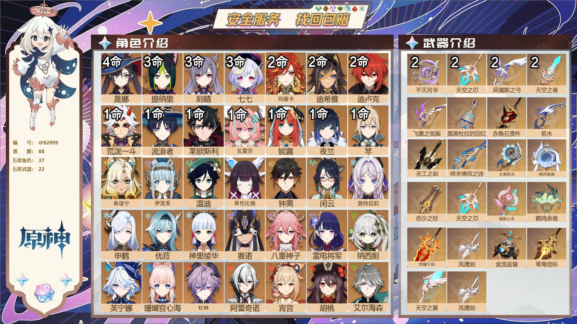 PX_2534903-,邮箱不出售,,冒险等级60级,男主,88黄,37个五星角色,22个五星武器,纠缠之源0--原石35--圣遗物1832--【时装】,岁夜欢哗,帆影游风,聆雨听竹,极夜真梦,雨化竹身,叶隐芳名,炽绘奇旅,倩影游侠,纱中幽兰, 【37个五星角色】,4命莫娜,3命提纳里,3命刻晴,3命七七,2命玛薇卡,2命迪希雅,2命迪卢克,1命荒泷一斗,1命流浪者,1命莱欧斯利,1命瓦雷莎,1命妮露,1命夜兰,1命琴,0命希诺宁,0命伊涅芙,0命温迪,0命哥伦比娅,0命钟离,0命闲云,0命茜特菈莉,0命申鹤,0命优菈,0命神里绫华,0命赛诺,0命八重神子,0命雷电将军,0命纳西妲,0命芙宁娜,0命珊瑚宫心海,0命杜林,0命阿蕾奇诺,0命宵宫,0命胡桃,0命艾尔海森,0命梦见月瑞希,0命埃洛伊, 【22个五星武器】,精2不灭月华,精2天空之刃,精2阿莫斯之弓,精2天空之脊,精1飞雷之弦振,精1图莱杜拉的回忆,精1赤角石溃杵,精1若水,精1无工之剑,精1终末嗟叹之诗,精1支离轮光,精1帷间夜曲,精1赤沙之杖,精1天空之刃,精1溢彩心念,精1鹤鸣余音,精1焚曜千阳,精1风鹰剑,精1金流监督,精1苇海信标,精1天空之翼,精1风鹰剑,9套, 【时装】,岁夜欢哗,帆影游风,聆雨听竹,极夜真梦,雨化竹身,叶隐芳名,炽绘奇旅,倩影游侠,纱中幽兰,