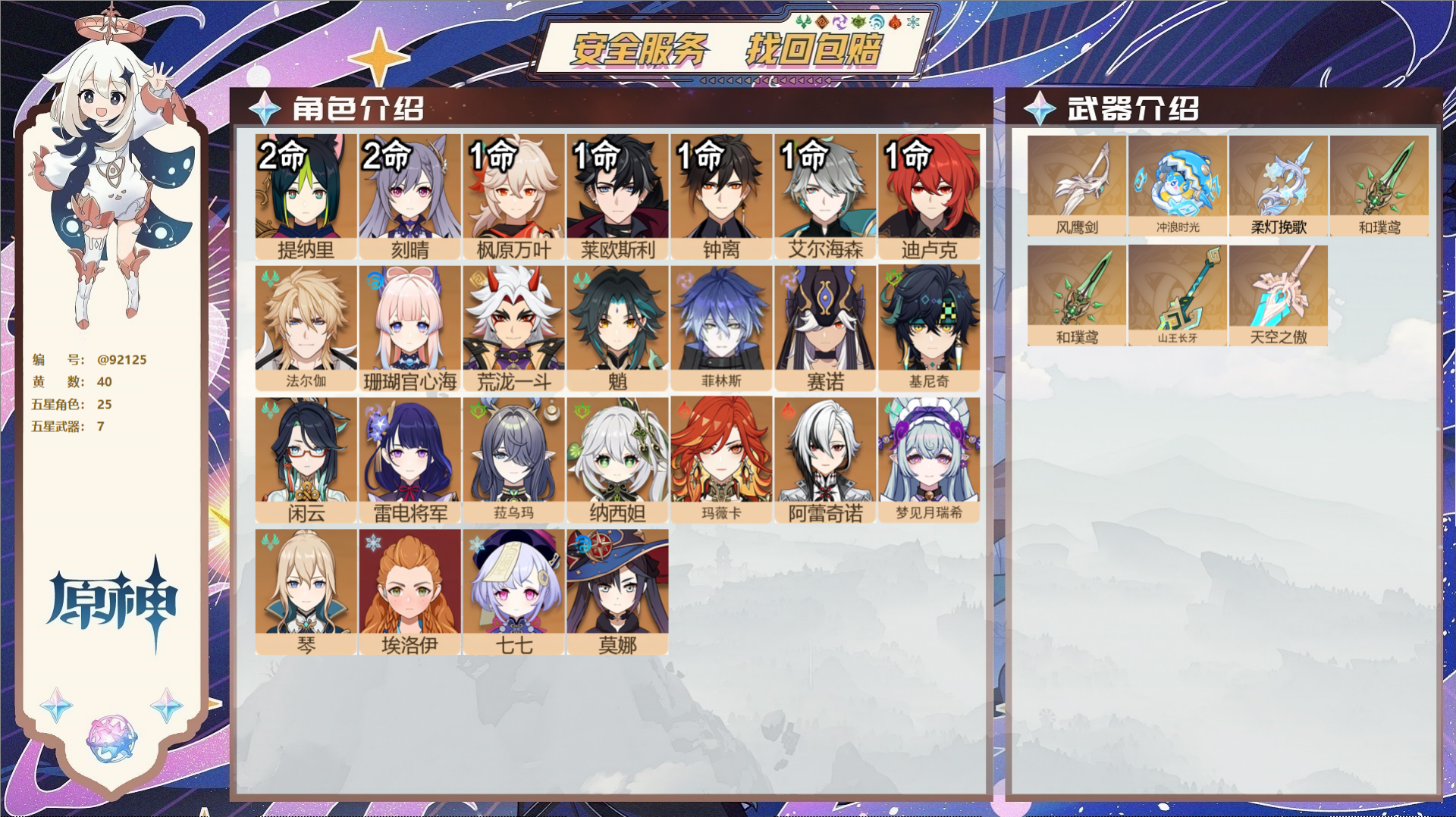 PX_2536809-,未绑定邮箱,,冒险等级59级,男主,40黄,25个五星角色,7个五星武器,纠缠之源0--原石293--圣遗物496--【时装】,闪耀协奏,叶隐芳名,倩影游侠,岁夜欢哗,雨化竹身,聆雨听竹,纱中幽兰, 【25个五星角色】,2命提纳里,2命刻晴,1命枫原万叶,1命莱欧斯利,1命钟离,1命艾尔海森,1命迪卢克,0命法尔伽,0命珊瑚宫心海,0命荒泷一斗,0命魈,0命菲林斯,0命赛诺,0命基尼奇,0命闲云,0命雷电将军,0命菈乌玛,0命纳西妲,0命玛薇卡,0命阿蕾奇诺,0命梦见月瑞希,0命琴,0命埃洛伊,0命七七,0命莫娜, 【7个五星武器】,精1风鹰剑,精1冲浪时光,精1柔灯挽歌,精1和璞鸢,精1和璞鸢,精1山王长牙,精1天空之傲,7套, 【时装】,闪耀协奏,叶隐芳名,倩影游侠,岁夜欢哗,雨化竹身,聆雨听竹,纱中幽兰,