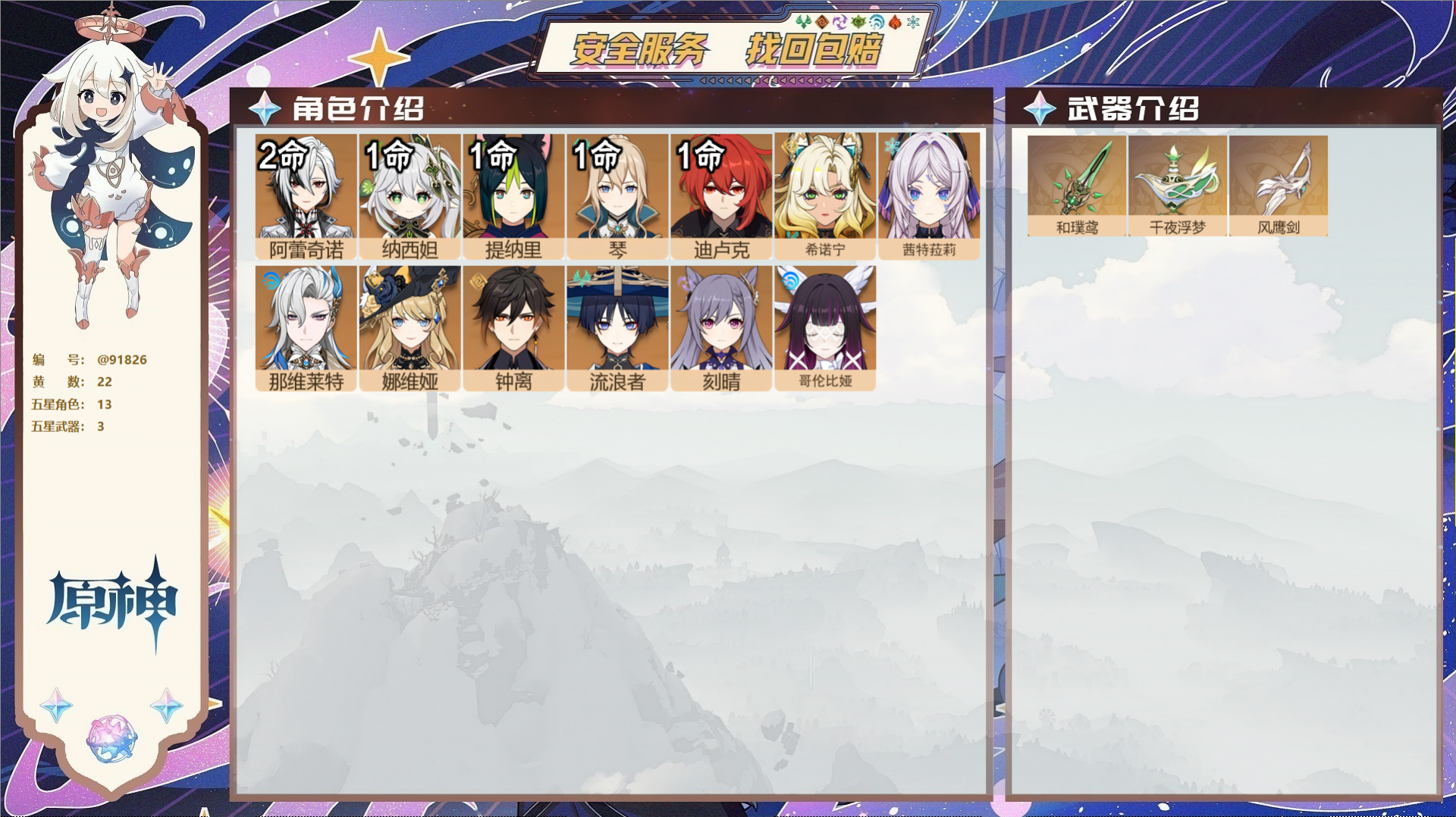 PX_2525938-,邮箱不出售,,冒险等级55级,男主,14黄,8个五星角色,4个五星武器,纠缠之源0--原石89--圣遗物71, 【8个五星角色】,1命恰斯卡,1命莫娜,0命奈芙尔,0命菈乌玛,0命哥伦比娅,0命法尔伽,0命刻晴,0命提纳里, 【4个五星武器】,精1星鹫赤羽,精1天空之翼,精1天空之傲,精1风鹰剑,