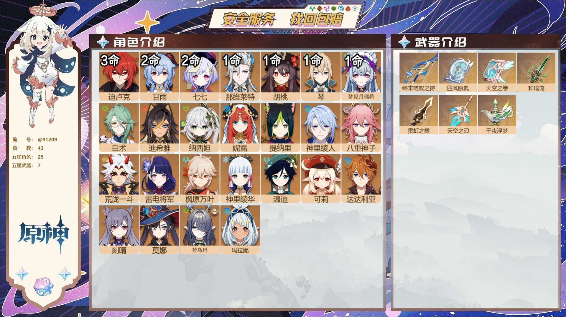 PX_2499423-,送已实名邮箱,,冒险等级59级,女主,43黄,25个五星角色,7个五星武器,纠缠之源0--原石89--圣遗物915--【时装】,叶隐芳名,纱中幽兰,闪耀协奏, 【25个五星角色】,3命迪卢克,2命甘雨,2命七七,1命那维莱特,1命胡桃,1命琴,1命梦见月瑞希,0命白术,0命迪希雅,0命纳西妲,0命妮露,0命提纳里,0命神里绫人,0命八重神子,0命荒泷一斗,0命雷电将军,0命枫原万叶,0命神里绫华,0命温迪,0命可莉,0命达达利亚,0命刻晴,0命莫娜,0命菈乌玛,0命玛拉妮, 【7个五星武器】,精1终末嗟叹之诗,精1四风原典,精1天空之卷,精1和璞鸢,精1贯虹之槊,精1天空之刃,精1千夜浮梦, 【时装】,叶隐芳名,纱中幽兰,闪耀协奏,
