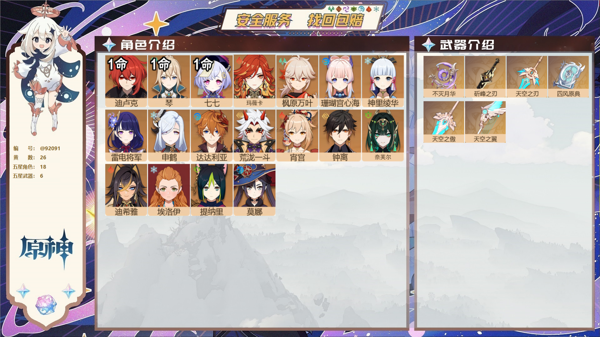 PX_2534891-,邮箱不出售,,冒险等级57级,女主,26黄,18个五星角色,6个五星武器,纠缠之源0--原石138--圣遗物346--【时装】,极夜真梦,炽绘奇旅,花时来信,叶隐芳名,雨化竹身, 【18个五星角色】,1命迪卢克,1命琴,1命七七,0命玛薇卡,0命枫原万叶,0命珊瑚宫心海,0命神里绫华,0命雷电将军,0命申鹤,0命达达利亚,0命荒泷一斗,0命宵宫,0命钟离,0命奈芙尔,0命迪希雅,0命埃洛伊,0命提纳里,0命莫娜, 【6个五星武器】,精1不灭月华,精1斫峰之刃,精1天空之刃,精1四风原典,精1天空之傲,精1天空之翼,四星角色:5命班尼特,5套, 【时装】,极夜真梦,炽绘奇旅,花时来信,叶隐芳名,雨化竹身,