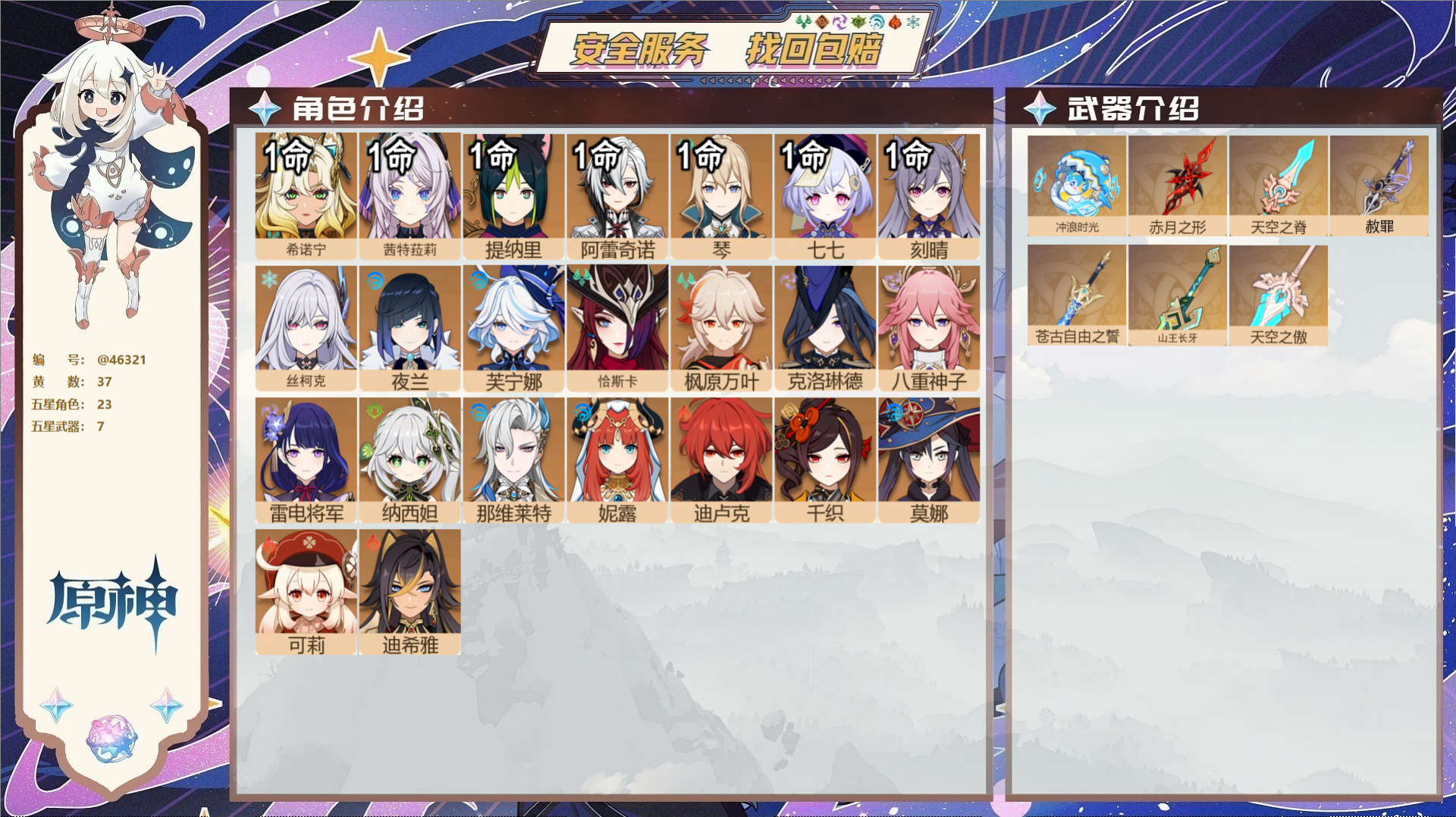 PX_2267703-,未绑定邮箱,,冒险等级60级,女主,37黄,23个五星角色,7个五星武器,纠缠之源0--原石44--圣遗物1712--【时装】,炽绘奇旅,岁夜欢哗,倩影游侠, 【23个五星角色】,1命希诺宁,1命茜特菈莉,1命提纳里,1命阿蕾奇诺,1命琴,1命七七,1命刻晴,0命丝柯克,0命夜兰,0命芙宁娜,0命恰斯卡,0命枫原万叶,0命克洛琳德,0命八重神子,0命雷电将军,0命纳西妲,0命那维莱特,0命妮露,0命迪卢克,0命千织,0命莫娜,0命可莉,0命迪希雅, 【7个五星武器】,精1冲浪时光,精1赤月之形,精1天空之脊,精1赦罪,精1苍古自由之誓,精1山王长牙,精1天空之傲,3套, 【时装】,炽绘奇旅,岁夜欢哗,倩影游侠,