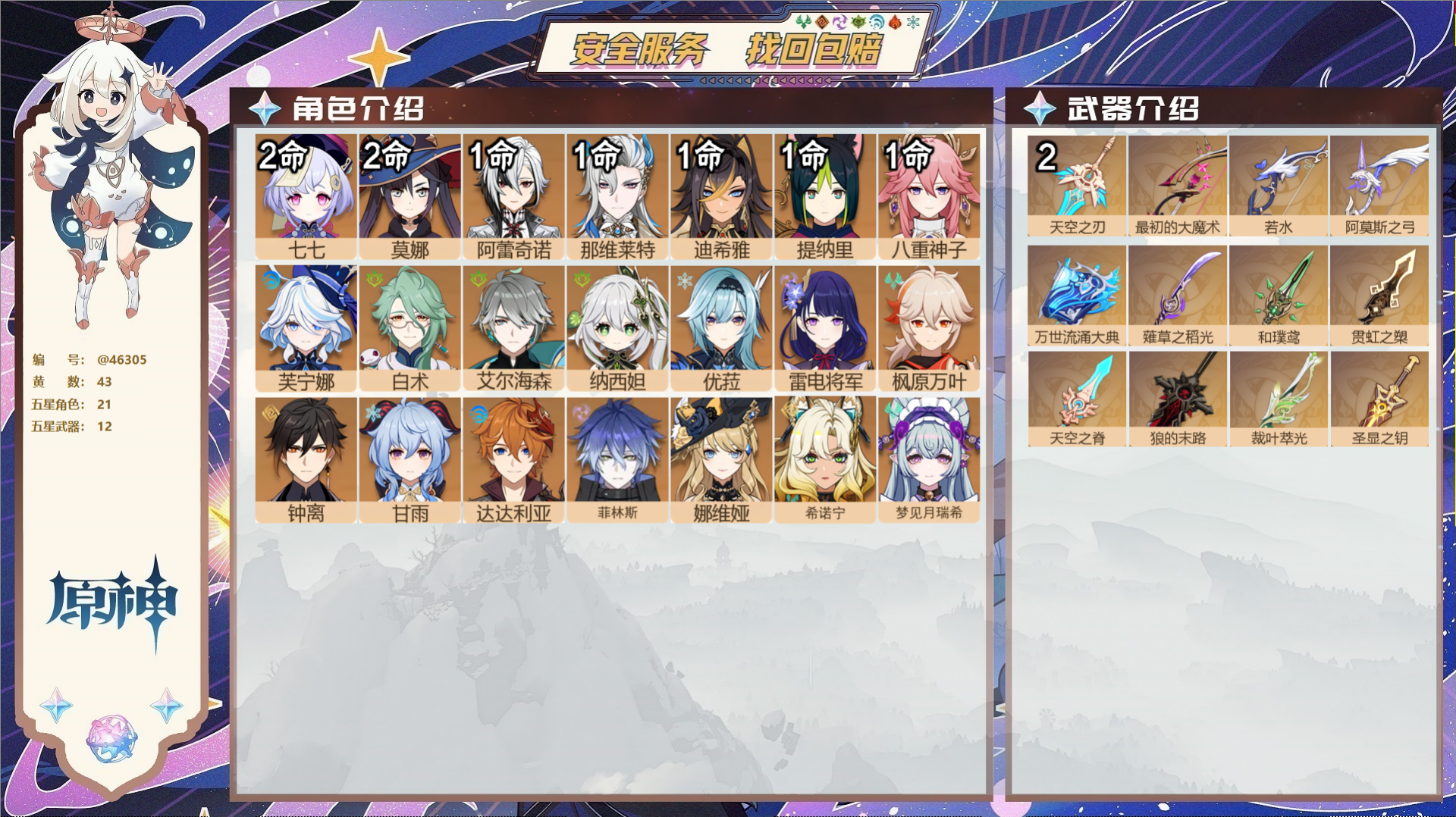PX_2267701-,未绑定邮箱,送TAP,冒险等级60级,男主,43黄,21个五星角色,12个五星武器,纠缠之源0--原石127--圣遗物567--【时装】,岁夜欢哗,倩影游侠,雨化竹身,叶隐芳名, 【21个五星角色】,2命七七,2命莫娜,1命阿蕾奇诺,1命那维莱特,1命迪希雅,1命提纳里,1命八重神子,0命芙宁娜,0命白术,0命艾尔海森,0命纳西妲,0命优菈,0命雷电将军,0命枫原万叶,0命钟离,0命甘雨,0命达达利亚,0命菲林斯,0命娜维娅,0命希诺宁,0命梦见月瑞希, 【12个五星武器】,精2天空之刃,精1最初的大魔术,精1若水,精1阿莫斯之弓,精1万世流涌大典,精1薙草之稻光,精1和璞鸢,精1贯虹之槊,精1天空之脊,精1狼的末路,精1裁叶萃光,精1圣显之钥, 【时装】,岁夜欢哗,倩影游侠,雨化竹身,叶隐芳名,