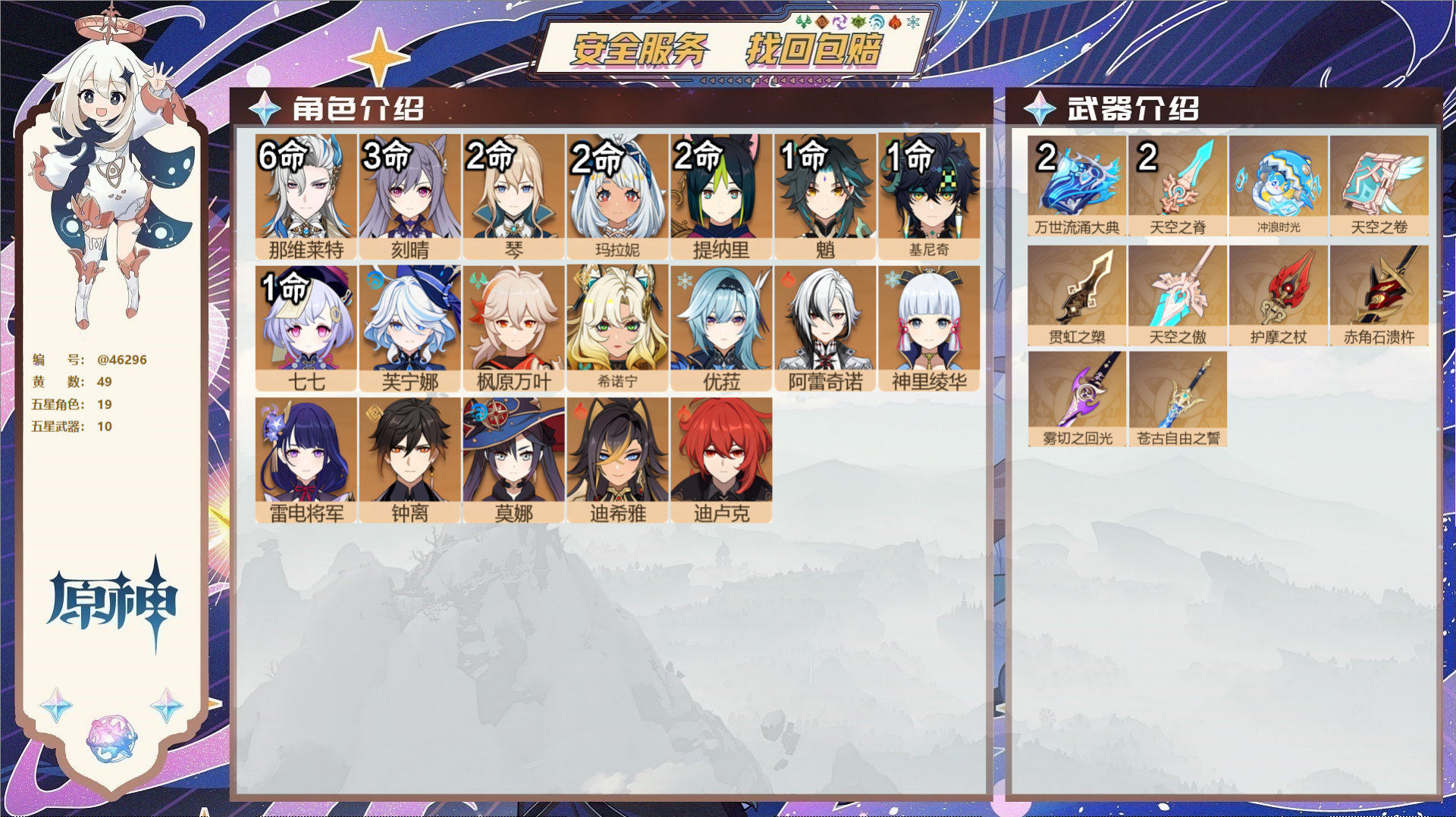 PX_2267710-,邮箱不出售,不送TAP,冒险等级60级,女主,50黄,25个五星角色,9个五星武器,纠缠之源0--原石107--圣遗物448--【时装】,叶隐芳名,极夜真梦,纱中幽兰,闪耀协奏,花时来信, 【25个五星角色】,3命琴,3命莫娜,2命申鹤,2命刻晴,2命七七,1命提纳里,1命温迪,1命迪卢克,0命芙宁娜,0命那维莱特,0命迪希雅,0命艾尔海森,0命纳西妲,0命夜兰,0命八重神子,0命雷电将军,0命神里绫华,0命钟离,0命胡桃,0命甘雨,0命宵宫,0命可莉,0命丝柯克,0命玛薇卡,0命梦见月瑞希, 【9个五星武器】,精2风鹰剑,精1阿莫斯之弓,精1息灾,精1和璞鸢,精1裁叶萃光,精1雾切之回光,精1狼的末路, 【时装】,叶隐芳名,极夜真梦,纱中幽兰,闪耀协奏,花时来信,