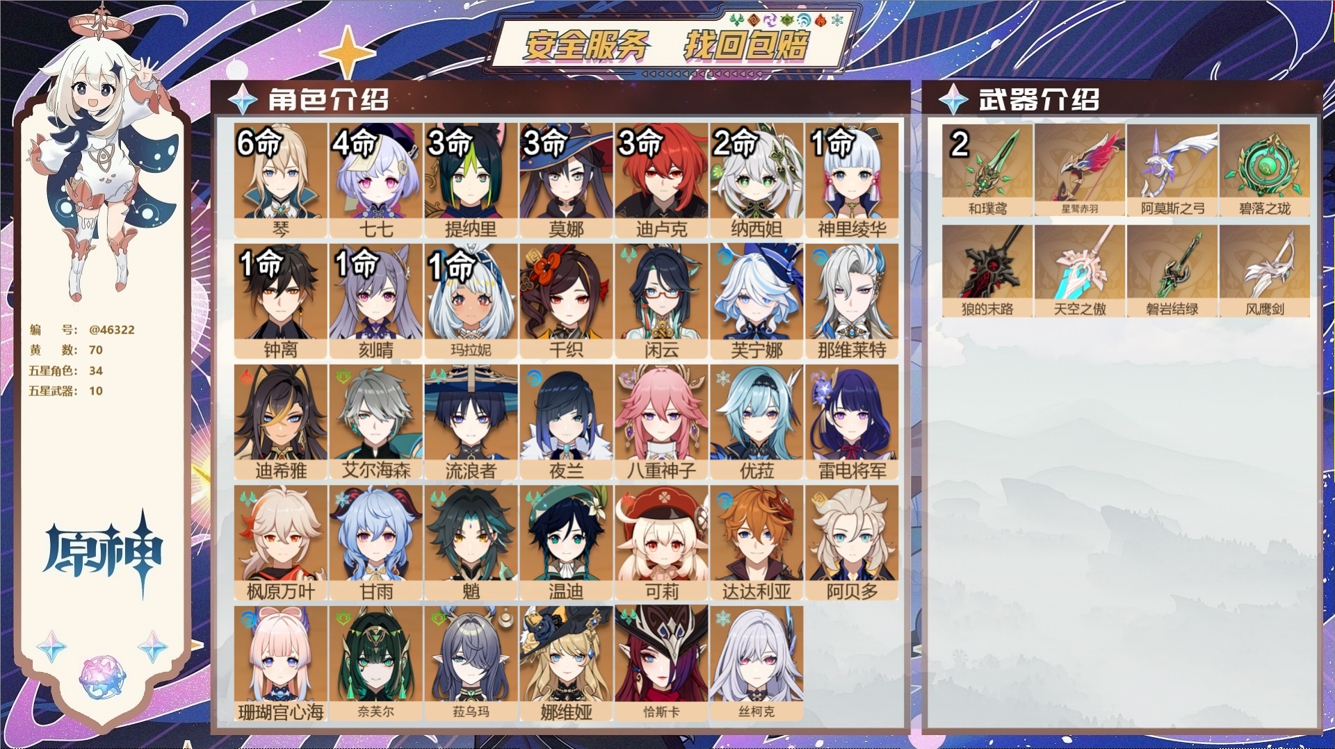 PX_2271165-,未绑定邮箱,不送TAP,冒险等级60级,男主,70黄,34个五星角色,10个五星武器,纠缠之源0--原石344--圣遗物1010--【时装】,炽绘奇旅,雨化竹身,帆影游风,倩影游侠,叶隐芳名,极夜真梦,纱中幽兰,花时来信, 【34个五星角色】,满命琴,4命七七,3命提纳里,3命莫娜,3命迪卢克,2命纳西妲,1命神里绫华,1命钟离,1命刻晴,1命玛拉妮,0命千织,0命闲云,0命芙宁娜,0命那维莱特,0命迪希雅,0命艾尔海森,0命流浪者,0命夜兰,0命八重神子,0命优菈,0命雷电将军,0命枫原万叶,0命甘雨,0命魈,0命温迪,0命可莉,0命达达利亚,0命阿贝多,0命珊瑚宫心海,0命奈芙尔,0命菈乌玛,0命娜维娅,0命恰斯卡,0命丝柯克, 【10个五星武器】,精2和璞鸢,精1星鹫赤羽,精1阿莫斯之弓,精1碧落之珑,精1狼的末路,精1天空之傲,精1磐岩结绿,精1风鹰剑, 【时装】,炽绘奇旅,雨化竹身,帆影游风,倩影游侠,叶隐芳名,极夜真梦,纱中幽兰,花时来信,