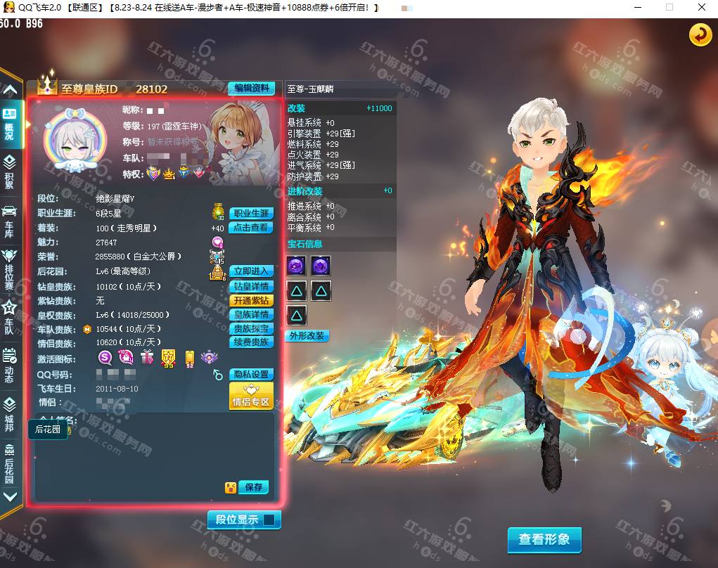 F15743,红六更号裙777584596【电信一区】红六自营,魅力1.1w,荣誉1159w,3S车:双四爆天甲/奥丁+29,双四雷诺之力/索尔+29,双四猛兽+29,T1:侍武之魂,A车*6:三四祥龙雷诺+29,双四天数雷诺/幻夜3阶+29,骑宠3页:人鱼公主+10,小兰仙+5,白金神兽+5,幻海之萤+5,飞虎王+5,座椅*1,套装女16页:浪漫苏打,套装男29页:空谷幽兰/浪漫苏打/金玉良缘发饰,1999R,