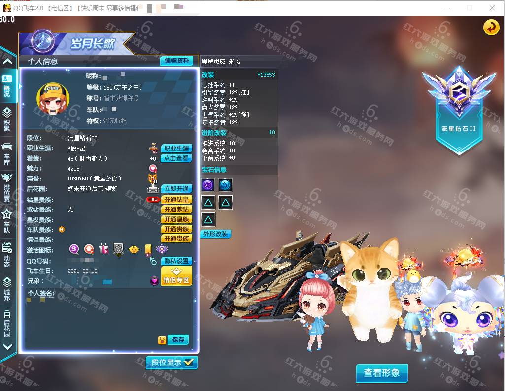F15761,红六更号裙762771576【电信一区】红六自营,魅力4205,荣誉103w,S车:单四黑域电魔/张飞+29,T1:启灵守护神,A车*4:大圣雷诺,天数雷诺/幻夜3阶,骑宠*5:笔墨扶摇+3,白金神兽+5,座椅*1,套装女9页,套装男8页,778R,