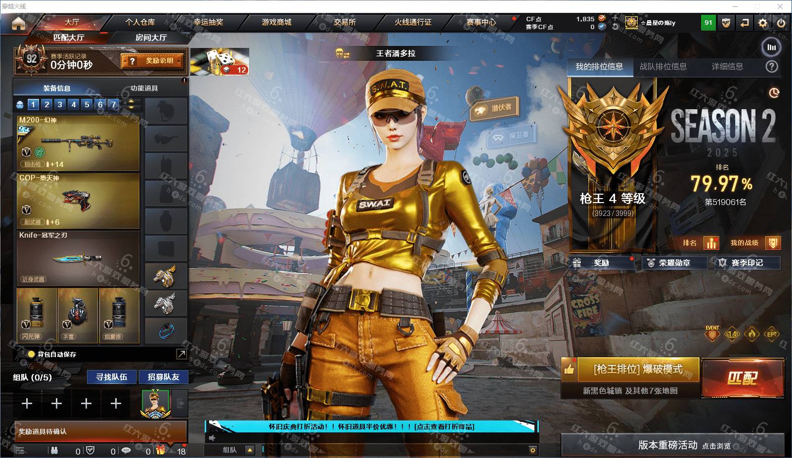 可二次实名 江苏一区59v2王者5炫金可排位/会员6/第2赛季未定级【/M4A1-青龙/HK417-朱雀/QBZ03-金色蔷薇/3把死亡之眼/3烈龙/2修罗/USP-冥王/尼泊尔雷霆/1套雷霆雷/】【黑骑士音效卡/毁灭音效卡/极光音效卡/】【/天龙-秘银/天神-暗月/天启-暗月/黑骑士-暗月/修罗-能量核心/无影-能量核心/修罗-能量核心/雷神-星空/战神-流金岁月皮肤/死神-秘银/火麒麟-雷神/战神-紫绶金章皮肤/战神-粉色甜心皮肤/黑骑士-暗月/火麒麟-华夏之心/天龙-CF STAR/火麒麟-CFSTAR/修罗-CFSTAR/AK47-老兵传说皮肤/】【/葵/瞳/乔月教练/云海玲珑/】【/王者之影/王者之翼/炫金武士/炫金超新星/炫金雷神/炫金骑士/炫金毁灭/M4A1-雷神-精英刀锋/M37-葵/COP-旗袍/迷你钢铁终结者/AK47-冰龙粉碎者/激光毁灭者III/激光毁灭者III-白马银枪/乱世-超越2/征服者-超越2/金色小号/】【战舰头盔/烟雾保护头盔化蛇/闪光护目镜/透明头盔/超级对讲机/战舰玩偶/超级背包3-7/防弹背包/战舰背包/炫彩背包/战舰水壶/特殊收纳包/战舰军袋/A背包套装扩展券/全背包/永久防弹衣防弹头盔手雷包C4工具钳】详情看图★星迈游★低价出售找回包赔